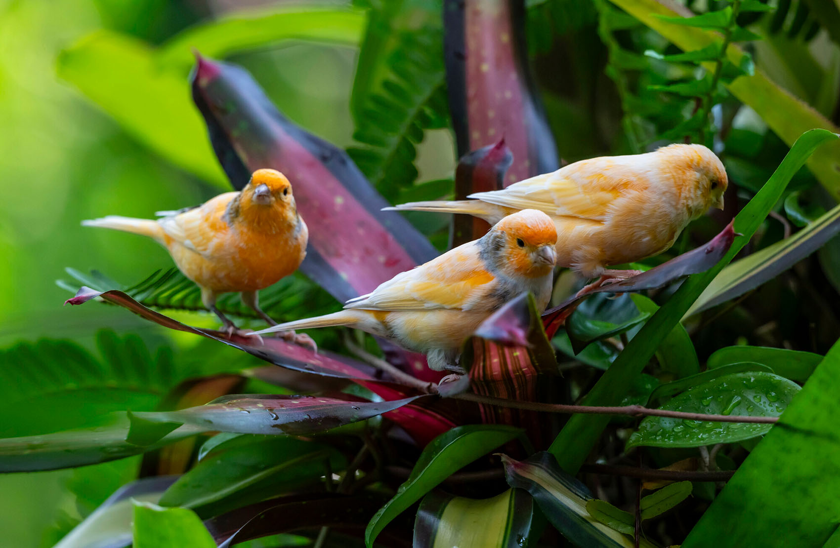 We host a number of adorable birds, like these happy canaries, that are selected because they do not harm the butterflies. Florida Museum photo by Jeff Gage