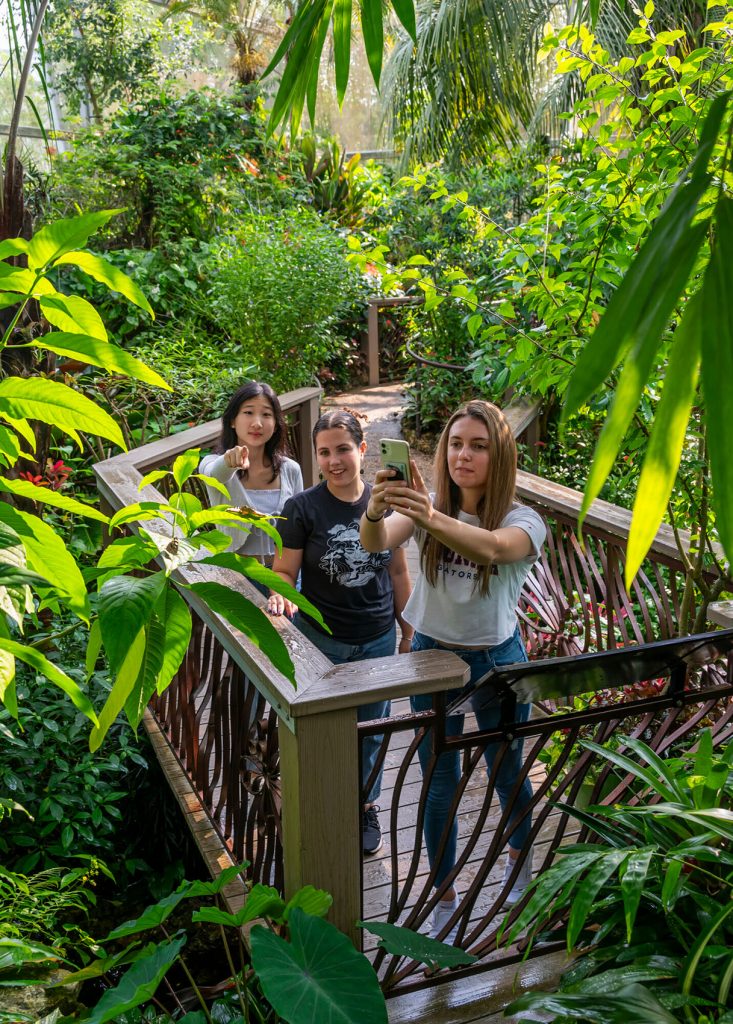 The lush landscape is planted in tropical trees and colorful flowering plants maintained by our exhibit keepers. Florida Museum photo by Jeff Gage