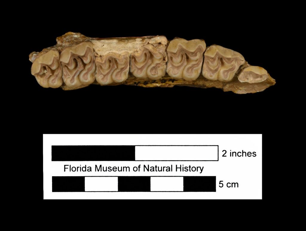 Several species of camelids—a group that includes camels, llamas, alpacas and more—once lived in Florida. This extinct species, Floridatragulus dolicanthereus, is only known from about 60 specimens found nearby at a fossil dig called Thomas Farm. It is sometimes called long-chinned camel and its species name dolicanthereus is from the Greek dolichan meaning ‘long’, and thereus from the Greek ‘-there‘, which means beast. Read more about this camel