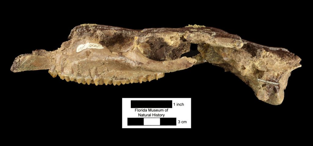 You might be familiar with the American alligator here in Florida, but this is Olsen’s alligator, Alligator olseni, an extinct species that once lived here also. It’s believed to have been much smaller than modern American alligators, rarely growing to more than seven or eight feet long, so about half the size of modern alligators. Learn more about this extinct alligator species