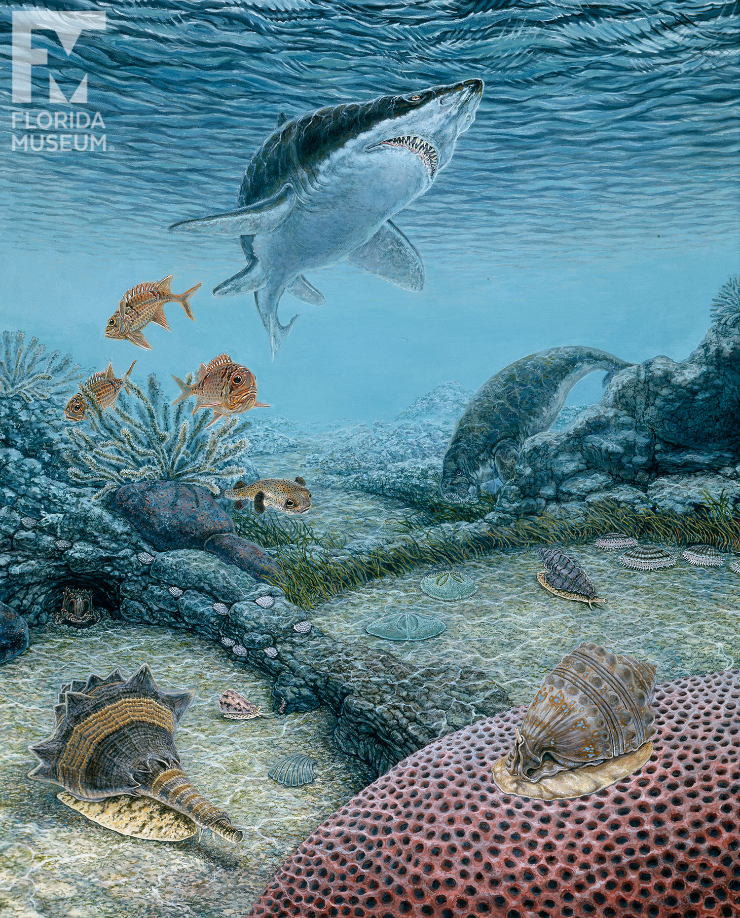 During the Oligocene, global temperatures cooled, trapping water in the polar ice caps and lowering sea levels. This exposed some of the Florida peninsula for the first time. The rest of the state remained under water, but these shallow seas saw great changes with new species taking the place of animals that no longer thrived here. Explore some of the marine animals of Florida’s Oligocene: