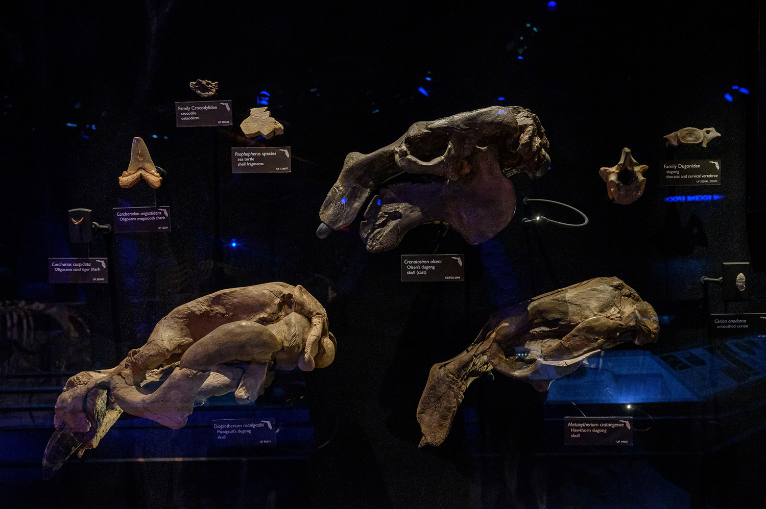 One of the most common type of mammal fossil found in Florida is of dugongs, also called sea cows. They are in the order Sirenia along with manatees, one of Florida’s most iconic animals. There were several species of dugongs living in the shallow coastal waters of our state, likely grazing on seagrass meadows. Examining the fossils of species like this Crenatosiren olseni can help paleontologists understand how this group evolved and the changes in Florida’s marine habitats during this time. Check out some of the species of dugong in our exhibit or read about fossil seagrass in our collection