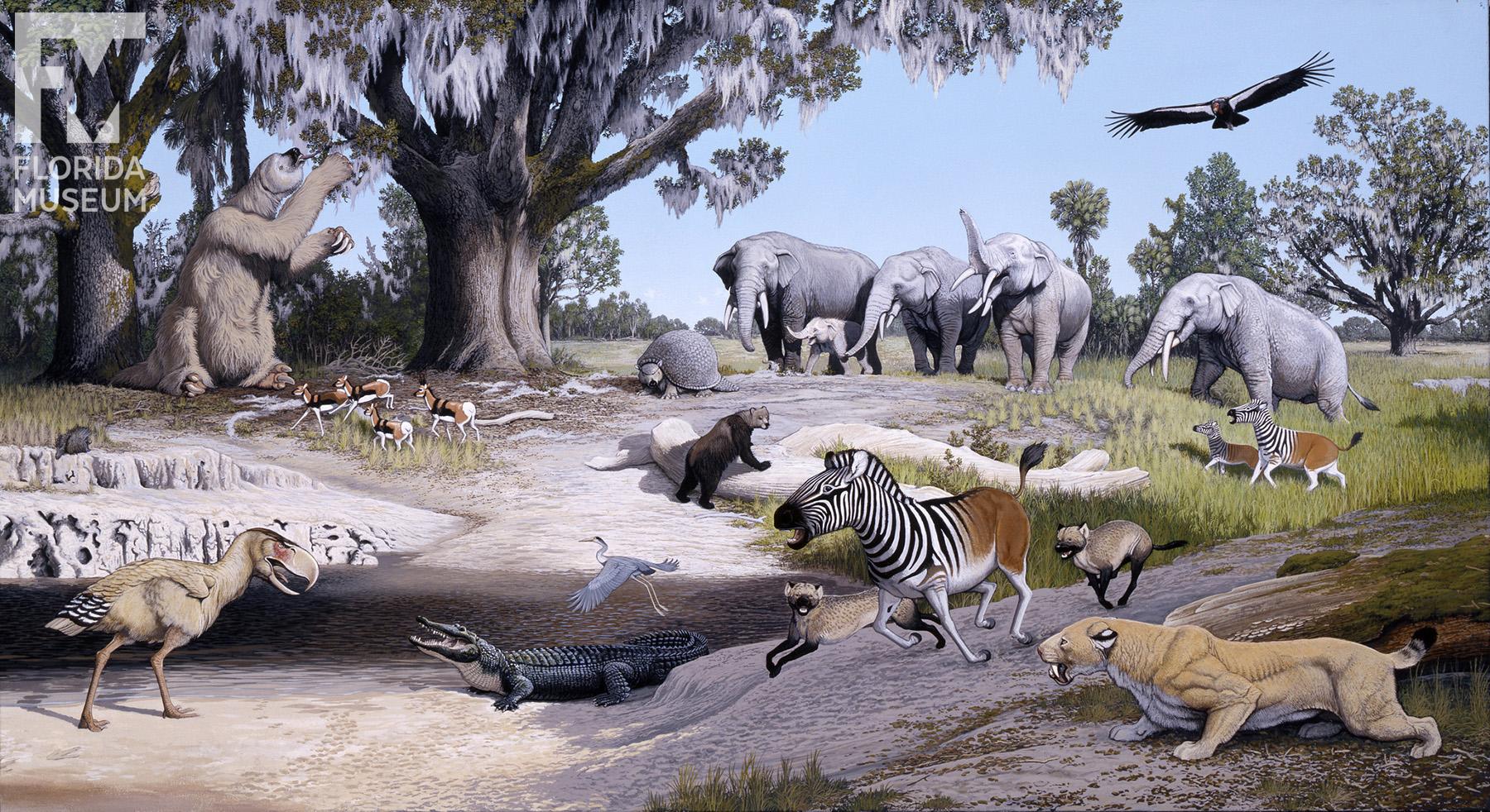 This painting was commissioned from artist Carl Buell for our Florida Fossils exhibit. Learn about the Pliocene animals represented: