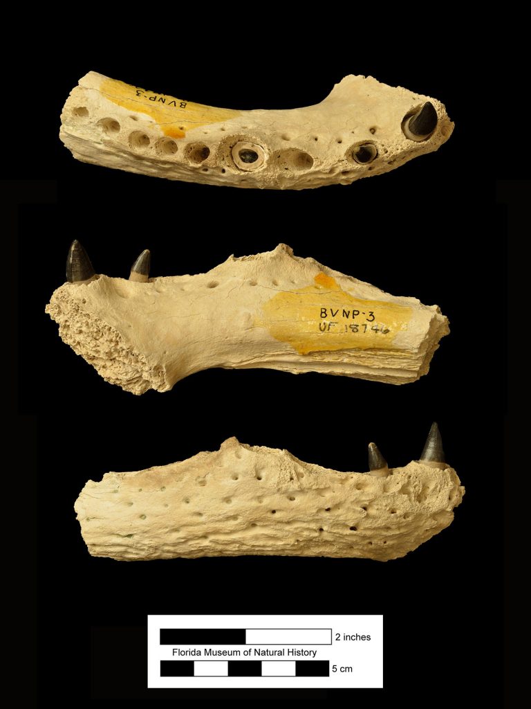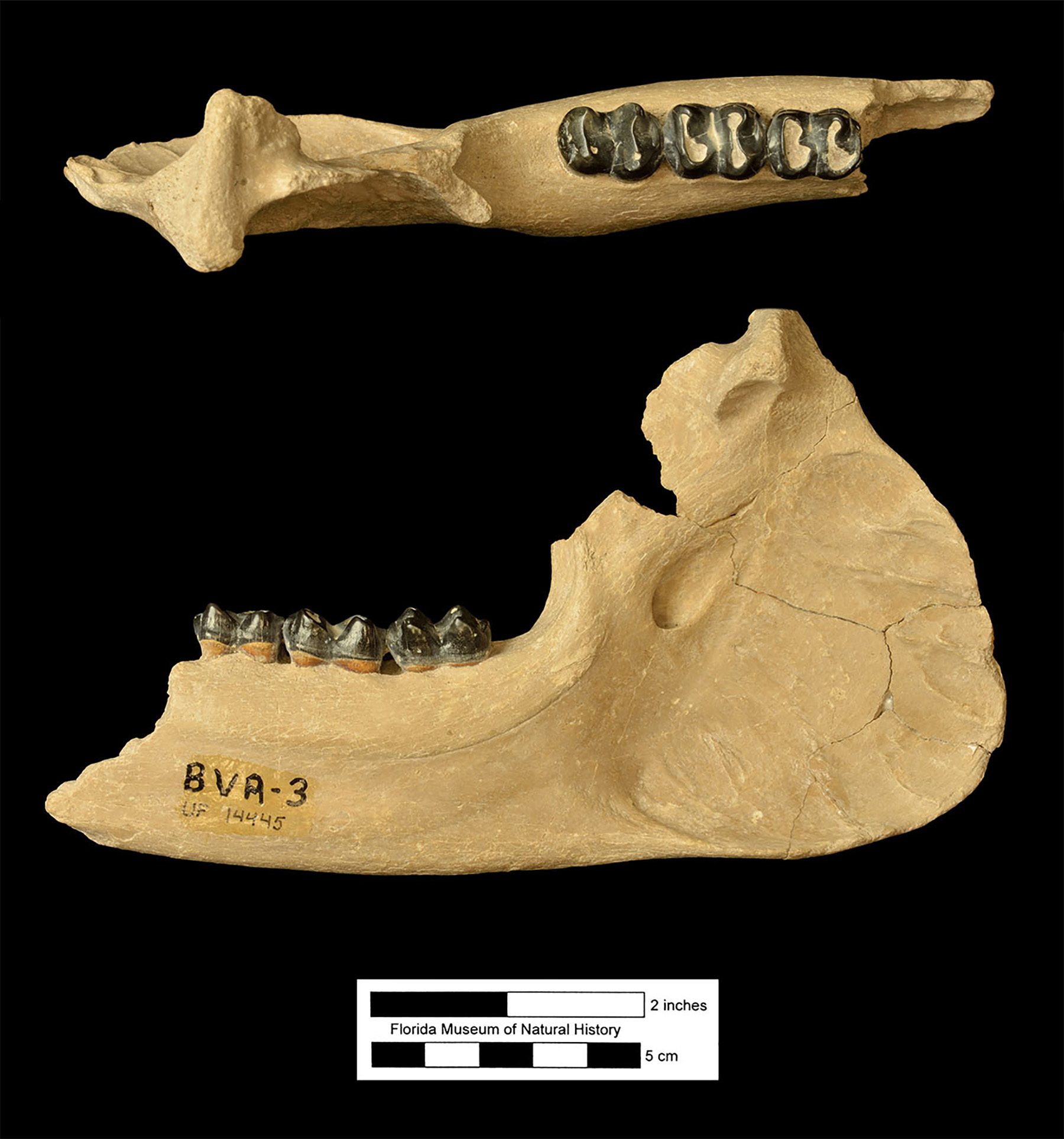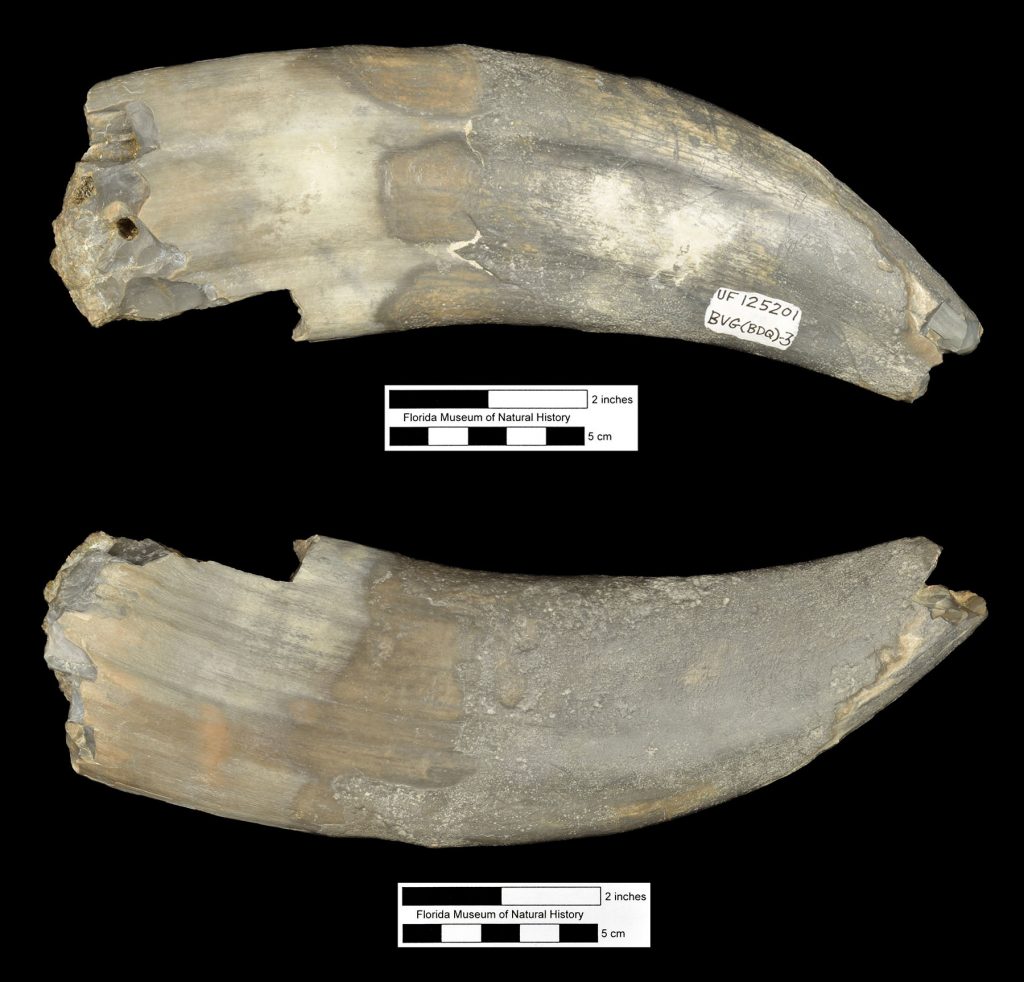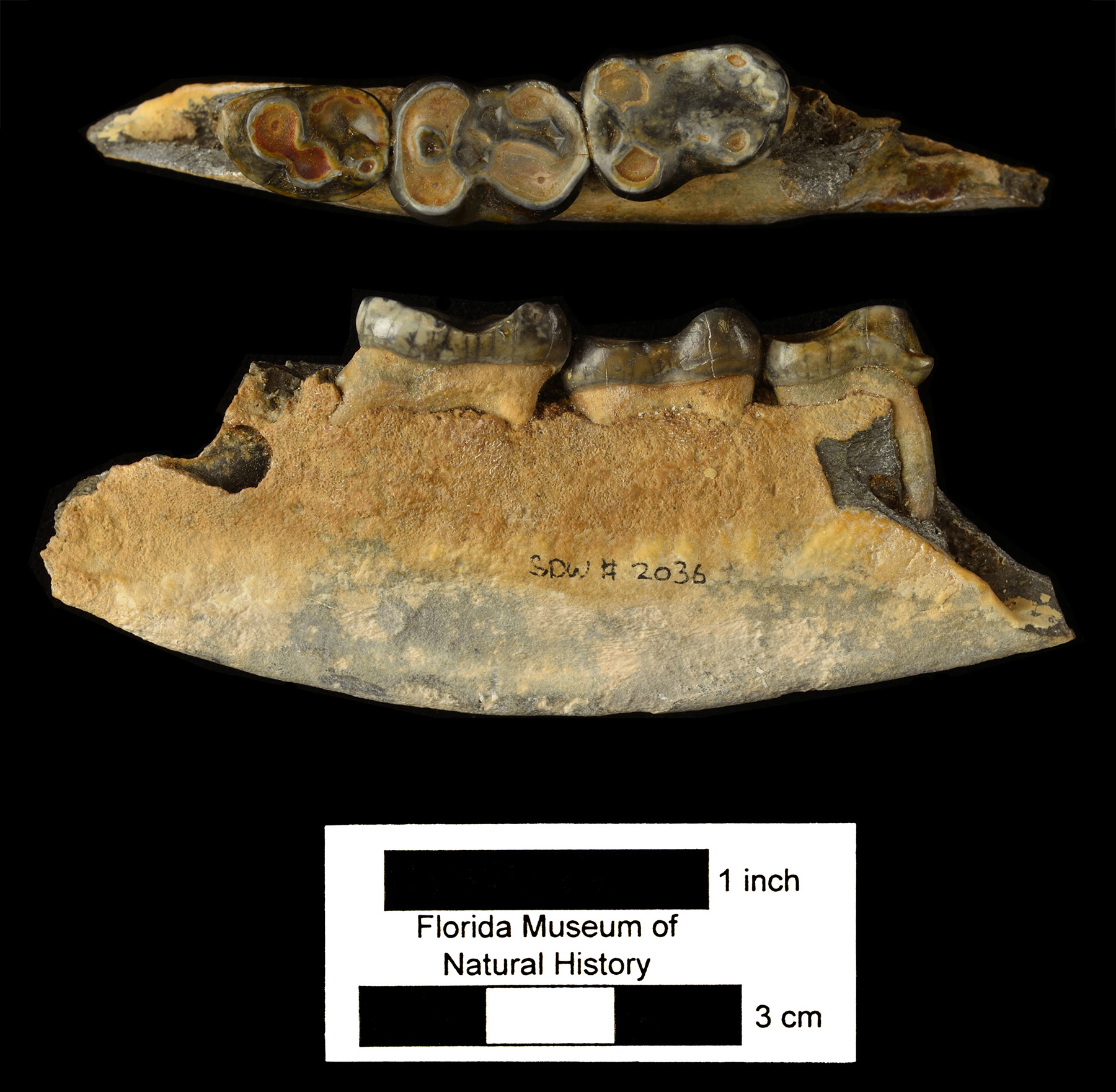 This period of great change saw many species disappear as well. The southern part of the state was still under water and our peninsula looked much different during the Pliocene than it does today. An early horse, Neohipparion eurystyle, and Fite’s saber-tooth cat (Rhizosmilodon fiteae) are two of the many Florida species that date to the early Pliocene. There are even specimens of walrus (Ontocetus emmonsi) in our collection from the early Pliocene.