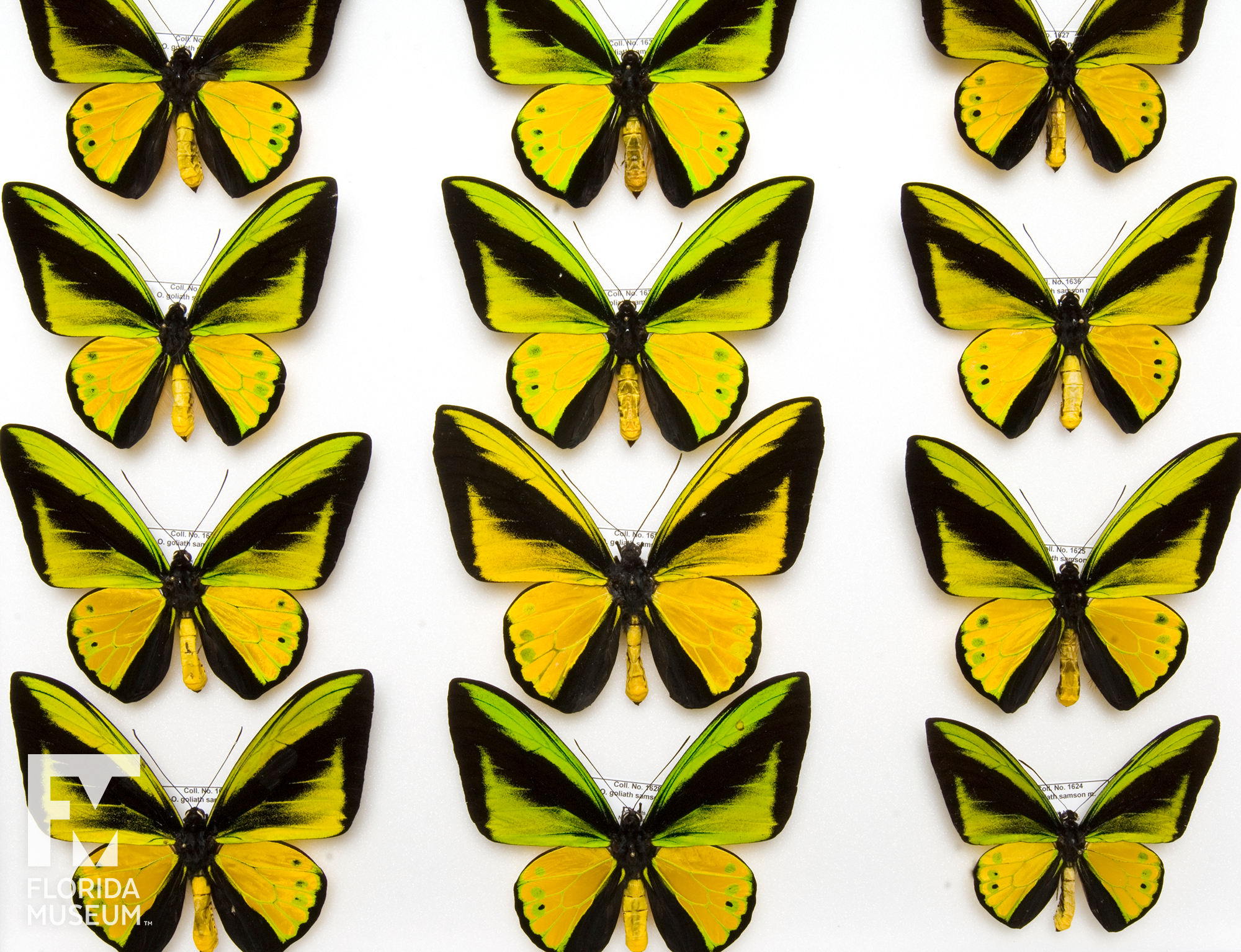 The Goliath birdwing, Ornithoptera goliath, is one of the largest species of butterflies in the world. The males have the brightly colored yellows, golds and greens dominating their wings, while the females have a lot of brown, with cream or yellowish areas and some brighter yellow markings.