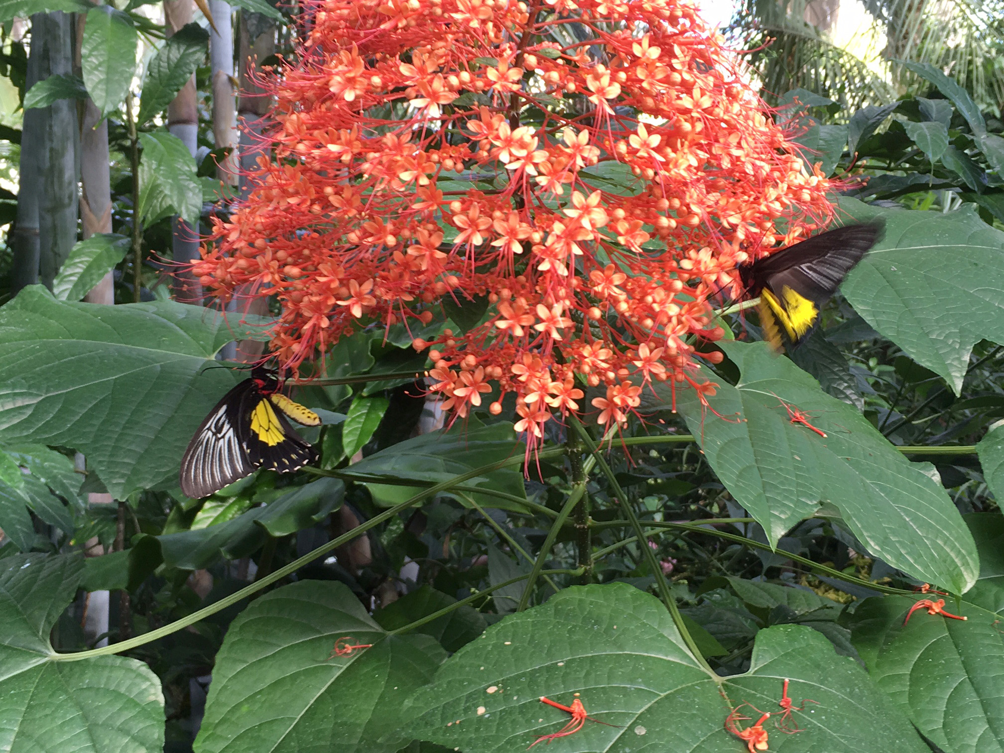 The Pagoda Flower is a favorite of swallowtails and it is not uncommon to see six or more butterflies feeding at once on one large flower cluster in the “Rainforest” exhibit. This is possible because a flower cluster can have hundreds of flowers, many open at the same time, and a mature plant can have a flower cluster over a foot tall and nearly as wide! Pagoda Flowers are tropical in nature and are evergreen in South Florida, but in North Central Florida they can be treated as perennials, freezing in winter and coming back in spring.
