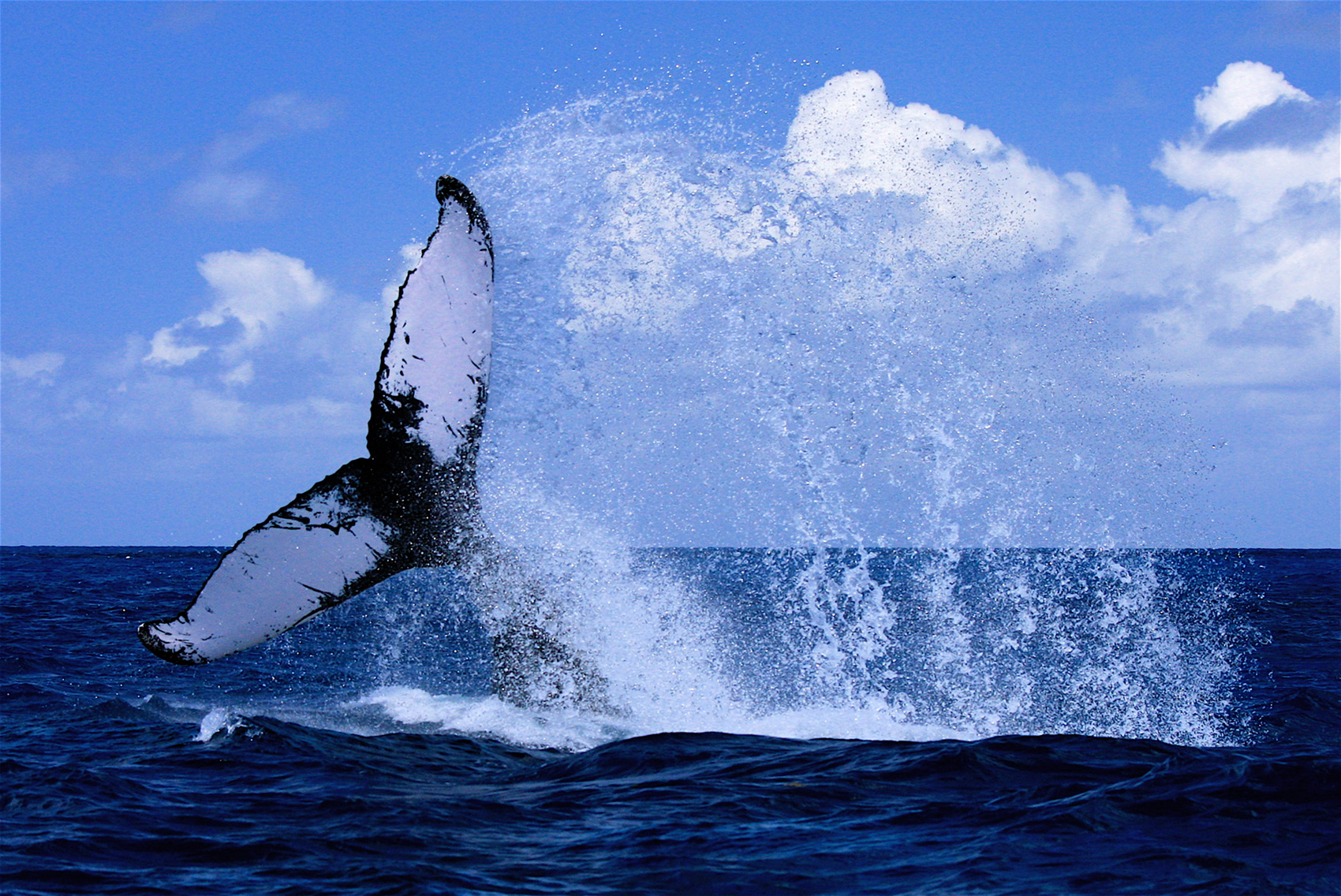 A Humpback calf “lobtailing” or slapping its tail fluke (tail fin) on the surface of the water. Each whale has unique fluke markings, like a fingerprint, that can be used for identification. Photo courtesy of Captain Gene Flipse/Conscious Breath Adventures