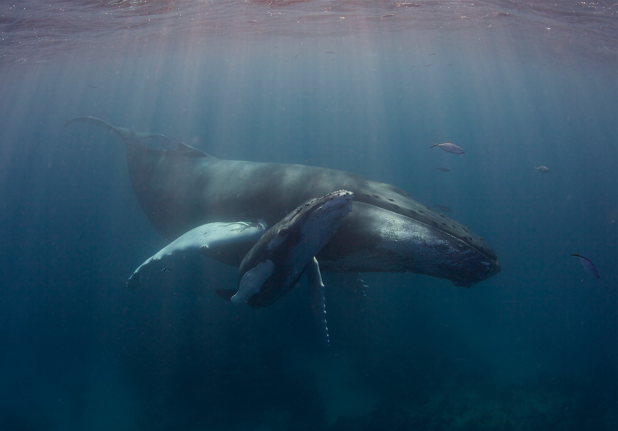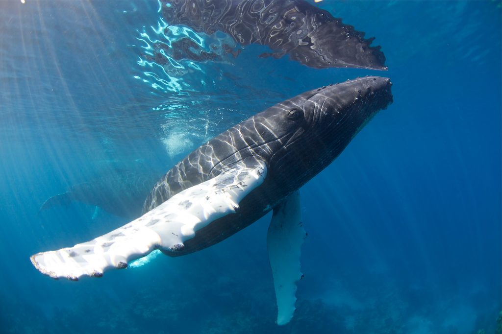 Using its prominent pectoral fins to help maneuver, a young Humpback whale calf explores its surroundings while its mother rests behind. Humpback whales have the largest pectoral fins of any species of cetacean (whale), averaging one third of their body length. Photo courtesy of Captain Gene Flipse/Conscious Breath Adventures