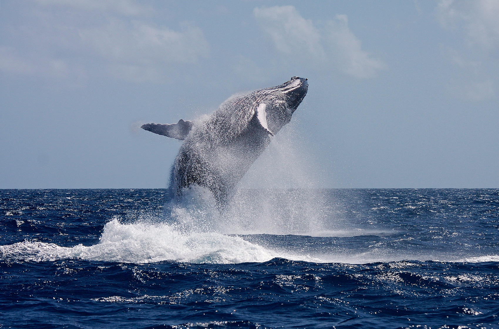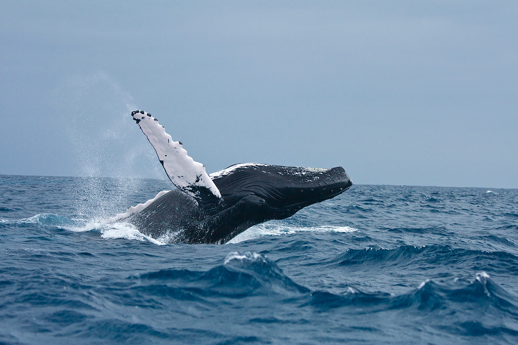 An adult Humpback whale performs a spectacular breach using its powerful fluke (tail fin) to launch itself out of the water with a twist to splash down on its back. Many whales breach, but none as much as the Humpback, making them a favorite of whale watchers worldwide. Photo courtesy of Captain Gene Flipse/Conscious Breath Adventures