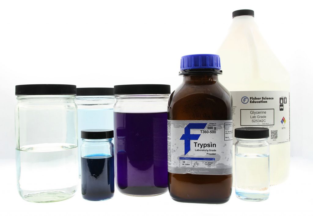 Chemicals and digestive enzyme used for clearing and staining specimens. Florida Museum photo by Zachary Randall