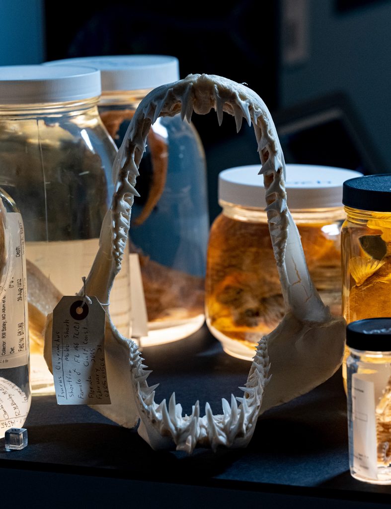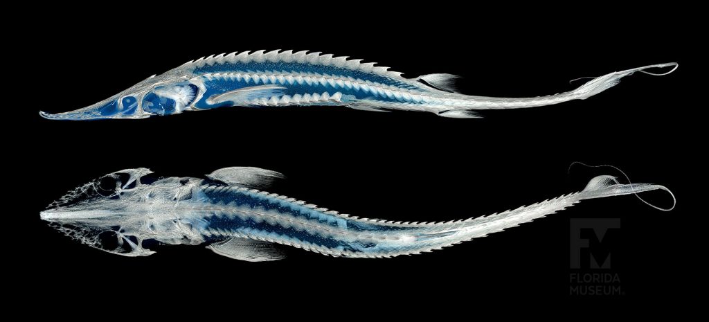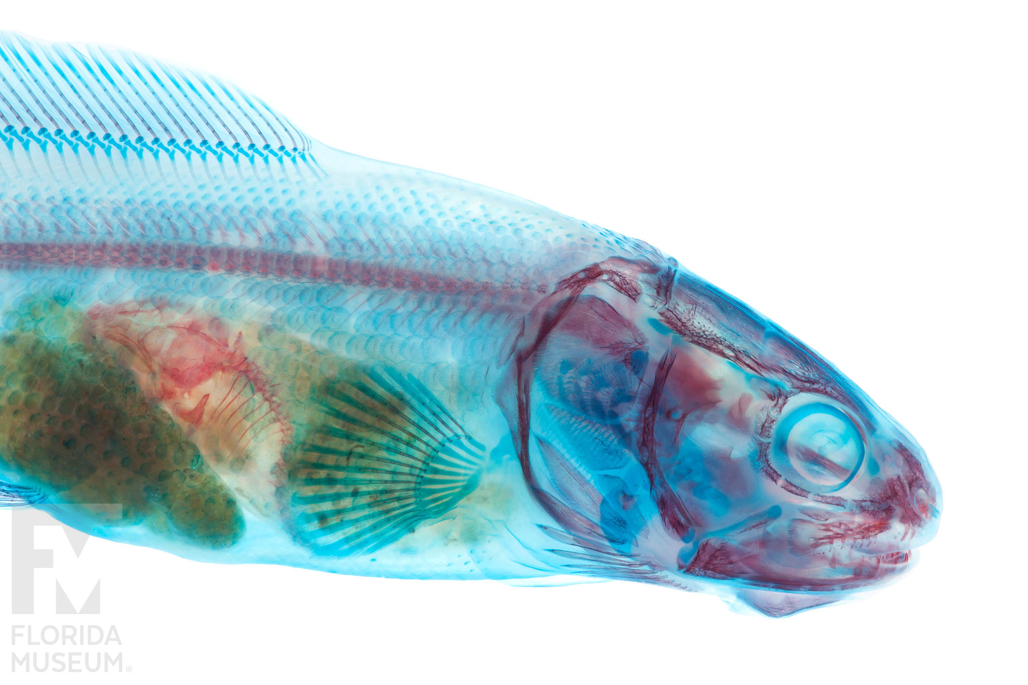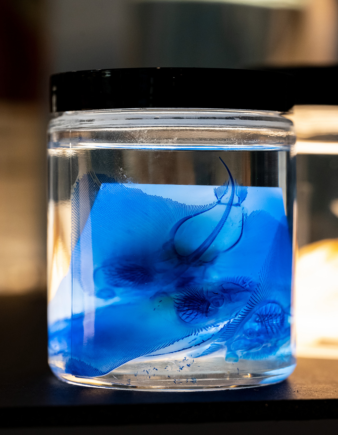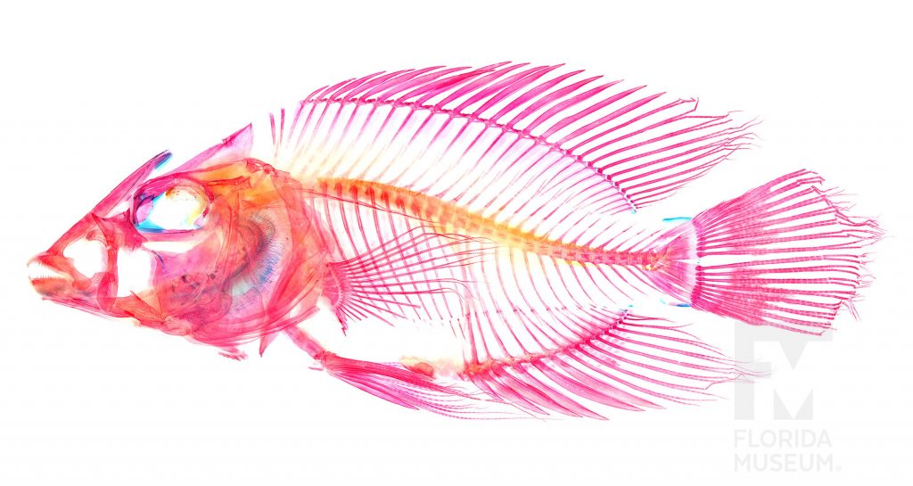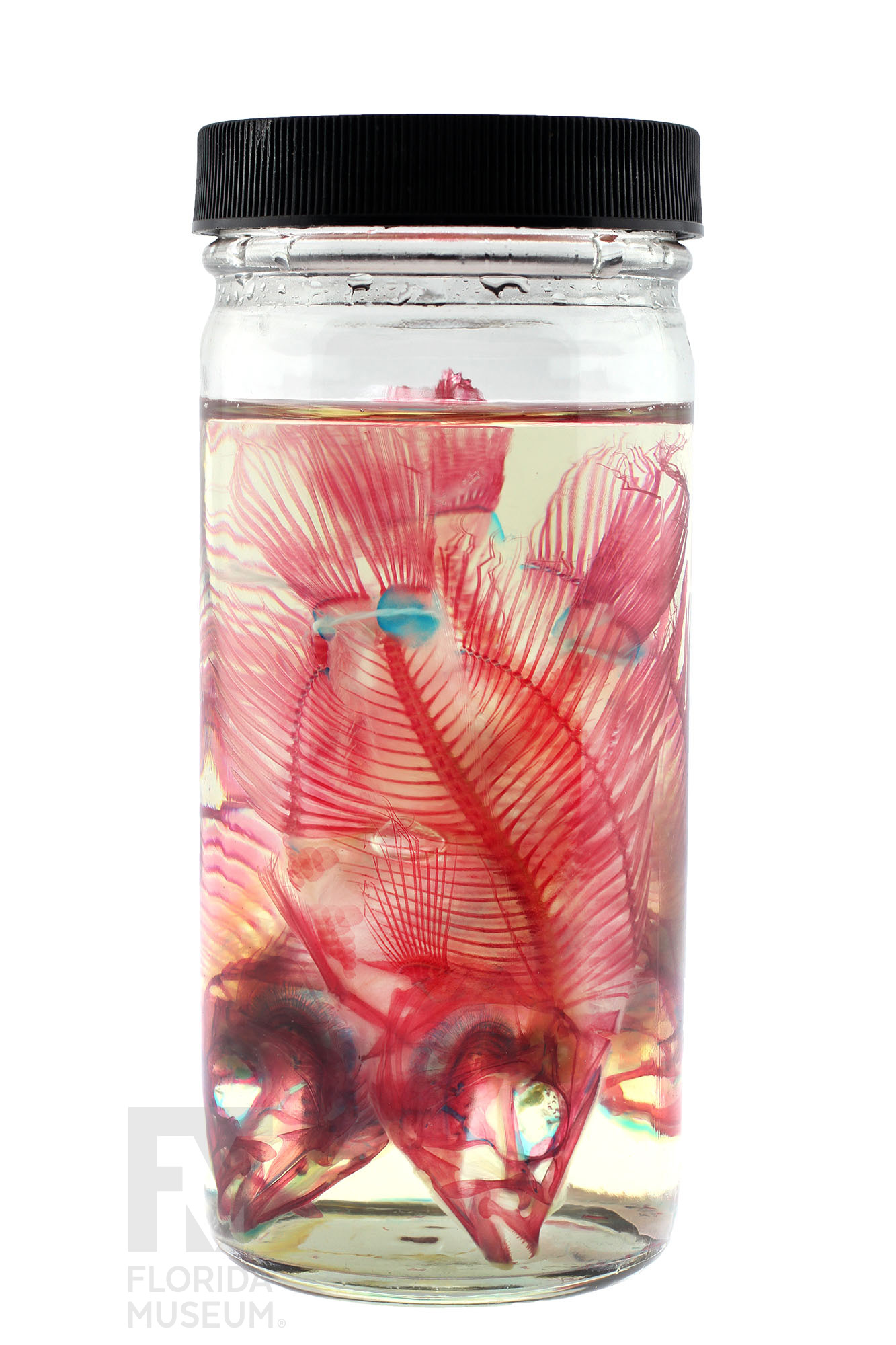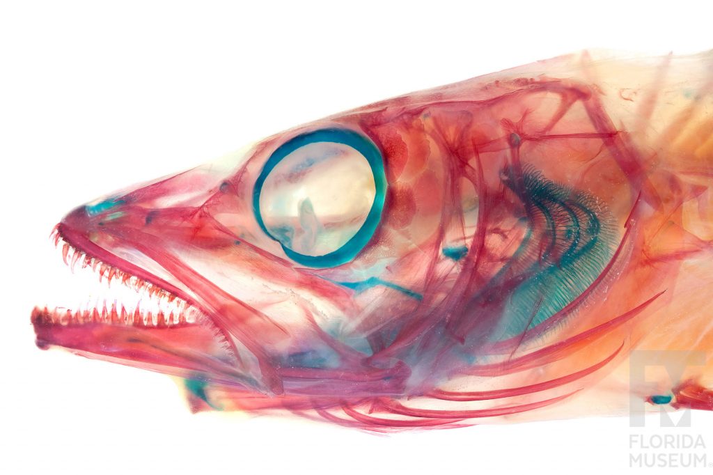 This exhibit showcases specimens from the Florida Museum’s fish collection revealing the beauty in the process of clearing and staining (also known as diaphonization). This process uses a digestive enzyme called trypsin to clear away soft tissue but not the collagen, which supports the skeleton in place. Chemicals are used to stain cartilage blue and bone red. This method has been used for over 100 years and is still used today in natural history collections, remaining an affordable and easily accessible option.