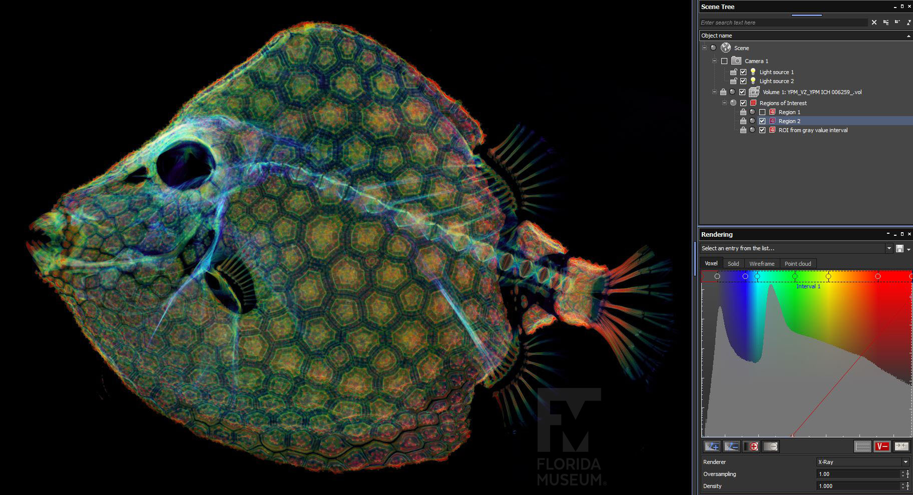 The Florida Museum and other natural history museums are using industrial micro CT scanners to capture a specimen’s anatomy in a non-destructive way. Through the use of x-rays, they digitally capture soft tissue and skeletal anatomy in 3D without causing damage or alteration to the specimen. Similar to getting a CT scan at the hospital, they capture hundreds to thousands of x-ray images of a whole specimen in a 360- degree rotation. These 2D x-ray images are then converted into slices (tomograms) and combined together to make a 3D model (volume). Preserved fish can be kept in these machines for hours without drying out or becoming damaged since they are packaged in plastic bags that help retain moisture.