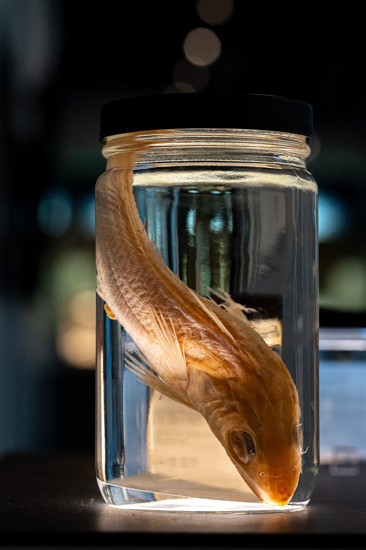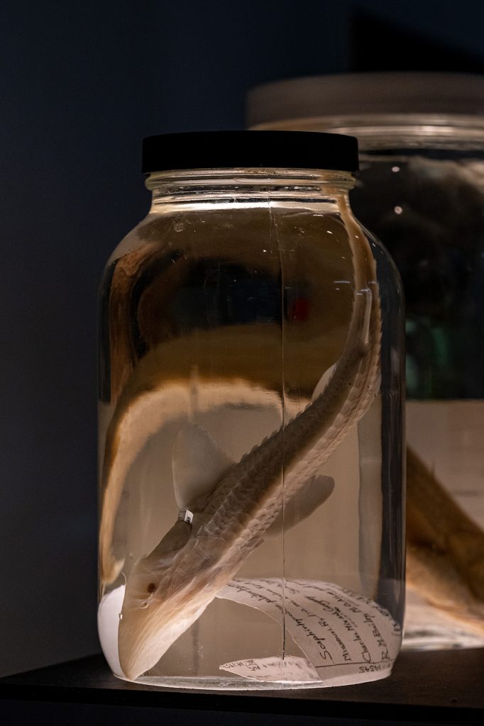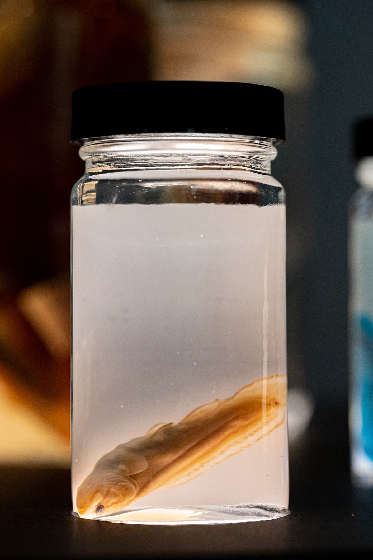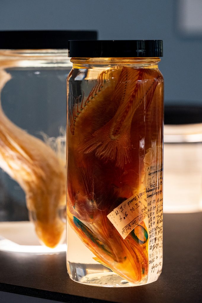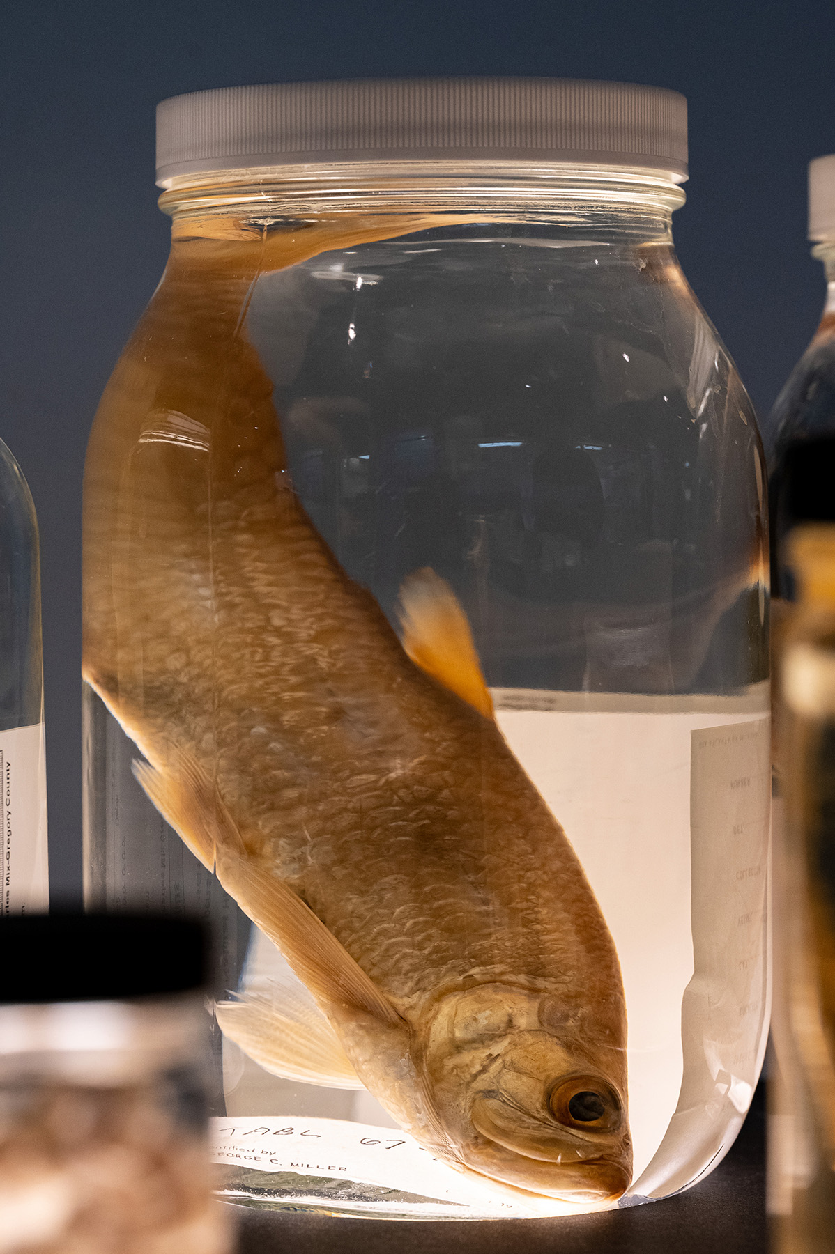 Jarred specimen of a Basketmouth cichlid, Caquetaia kraussii, in the Inner Beauty exhibit. Florida Museum photo by Kristen Grace