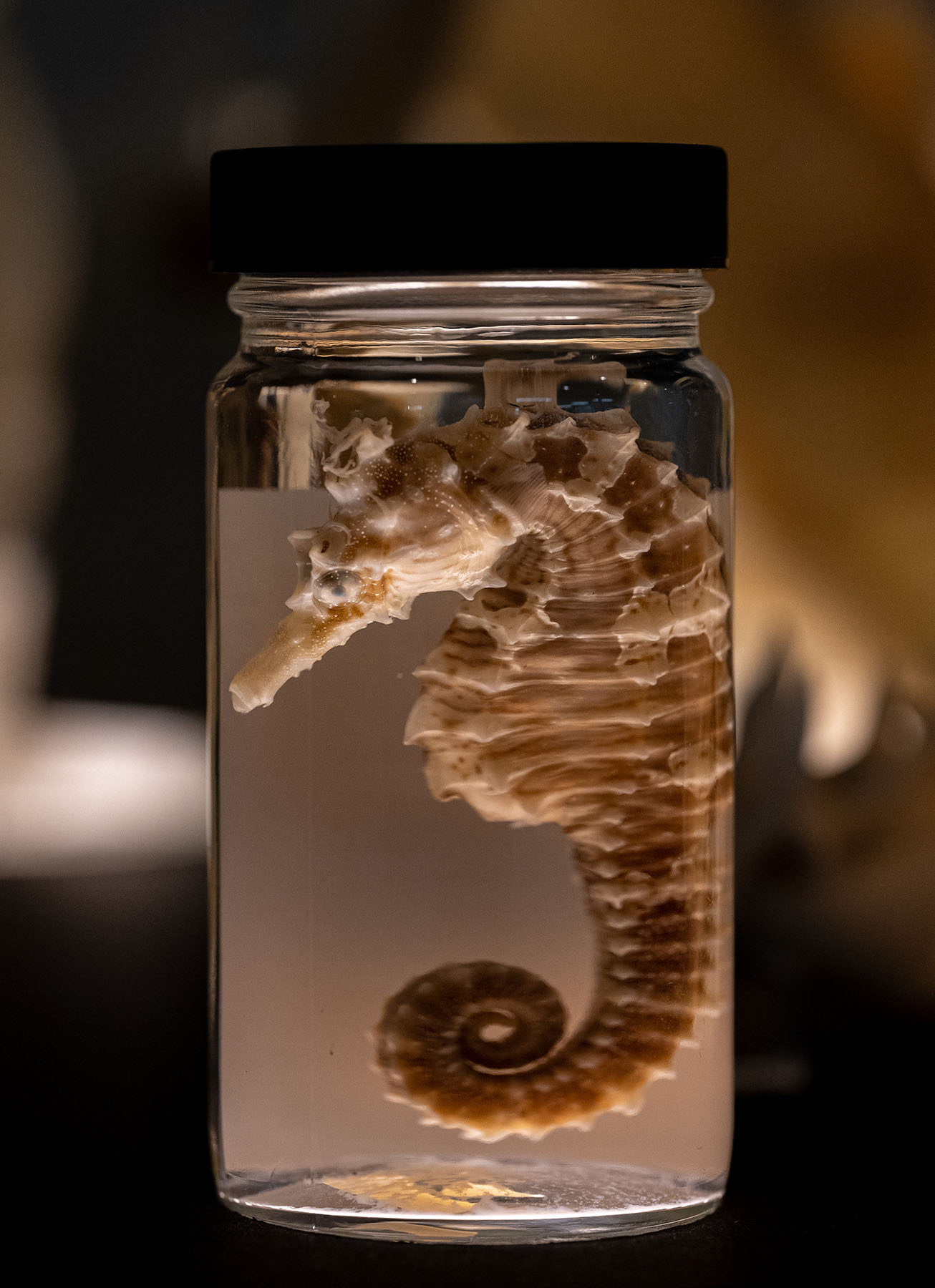 Jared specimen of a Lined seahorse, Hippocampus erectus in the Inner Beauty exhibit. Florida Museum photo by Kristen Grace