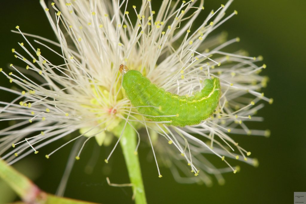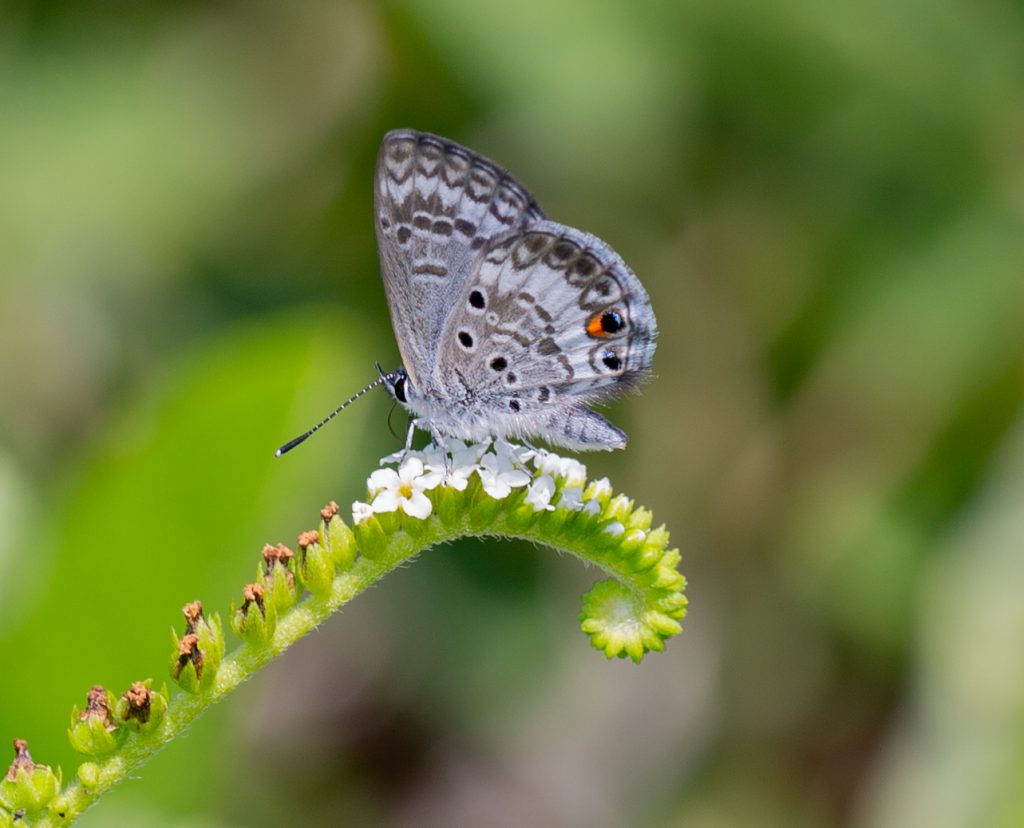 The Miami blue’s host plants, Keys blackbead and grey nickerbean, are both common on South Florida beaches. In addition to their host plants, the Miami blue butterfly also requires nectar flowers in order to survive. Some of their preferred flowers include scorpion tail (Heliotropium angiospermum) and snow squarestem (Melanthera nivea).