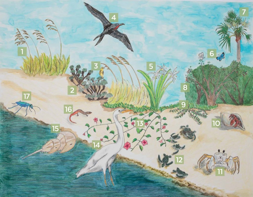 These beach ecosystems are dynamic places that change with shifting sands and storms. Beaches in the Florida Keys are harsh environments, exposed to high winds, salt water spray and occasional flooding, extreme heat, and seasonal droughts. These beaches are home to a diverse array of plants and animals that are uniquely adapted to these conditions.