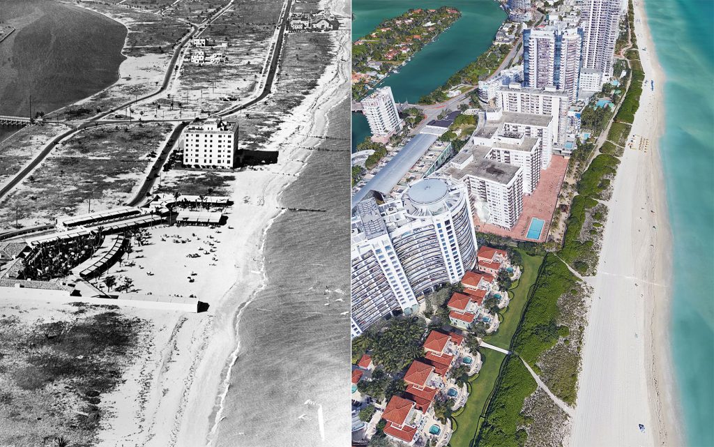 Aerial views of Miami Beach in 1925 and 2018. In 1920, the population of Dade County, Florida, was 42,753. In 2017, it was 2,702,602. Photo Courtesy of State Archives of Florida and Google.
