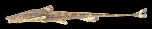 Identification: Breitensteinia insignis is long and slender with a long low adipose ridge but no adipose fin, low neural spines in the caudal vertebrae, a long and slender caudal peduncle (34-37%% SL), a small eye (2-3% head length), the gill opening not extending above the pectoral fin base, 11-12 principal caudal rays, 5 branchiostegal rays, and 44-45 vertebrae. The broad, depressed head is covered with small, indistinct tubercles. Tubercles on the body are arranged in 5-6 horizontal rows on both sides. The anterior nostril is tubular, and the caudal fin has a straight posterior margin. The narrow occipital process reaches the predorsal plate. The posterior edge of the pectoral spine has 12-14 large serrae. Body and head dark brown above with scattered light brown spots, light brown to cream-colored below with few brown spots. Dark brown bands on fins. To 6 � in. (16 cm) total length.