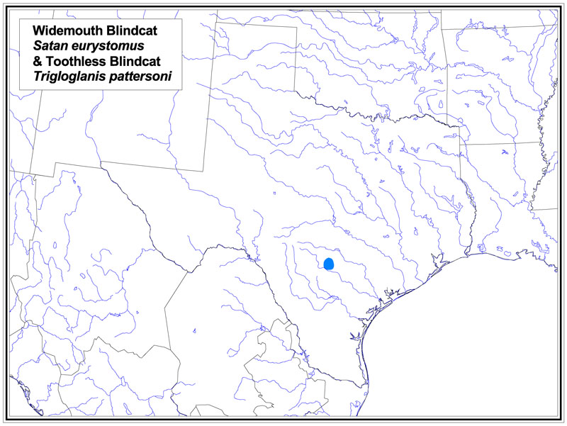 Range and Habitat: Like the Widemouth Blindcat, Satan eurystomus, the Toothless Blindcat lives in the San Antonio Pool of the Edwards Aquifer in and near San Antonio in Bexar County, Texas, and is thought to be common.