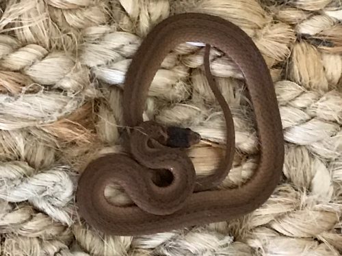 Most adult Dekay’s Brownsnakes are about 9-13 inches (23-33 cm) in total length. These snakes are small, thin, and may be grayish-brown or light brown. Adults have a faint light stripe running down the middle of the back that is boarded on both sides by parallel rows of small black spots, which may be connected across the back. The back of the neck and top of the head are dark brown, and there is a light band across the back of the head. Juveniles are dark brown with a whitish band across back of head.