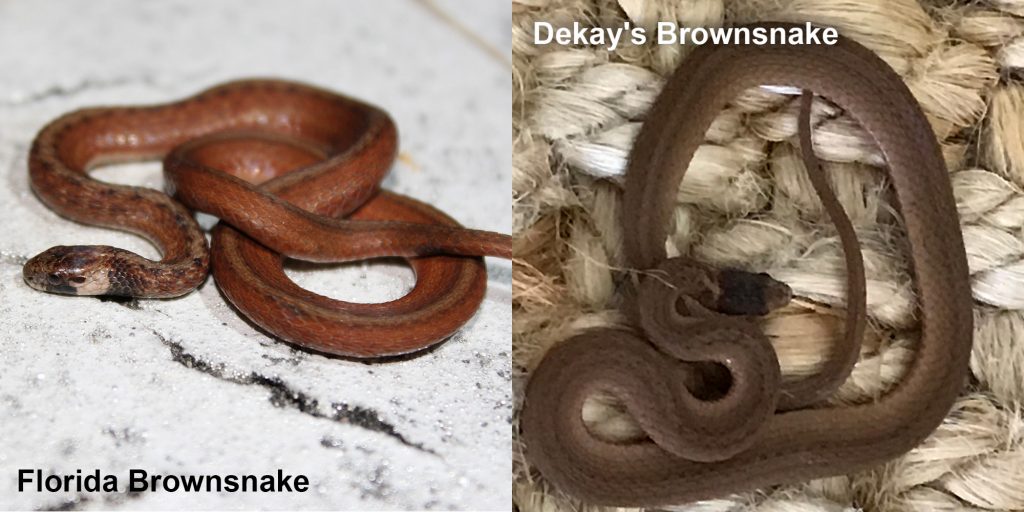 Adult Dekay’s Brownsnakes in Florida are about 9-13 inches (23-33 cm) in total length, with a record length recorded of 20.8 inches (52.7 cm). These snakes are small, thin, and may be grayish-brown or light brown. Adults have a faint light stripe running down the middle of the back that is boarded on both sides by parallel rows of small black spots, which may be connected across the stripe on the back. The back of the neck and top of the head are dark brown, and there is a light band across the back of the head between the darker areas. The upper lip scales are whitish except for a small dark marking under each eye. The belly is tannish to pinkish, often with black dots along the edges. The scales on the back are keeled (each scale has a prominent raised ridge) and arranged in 17 scale rows at midbody. The pupil is round. Juveniles are dark brown with a whitish band across back of head.
