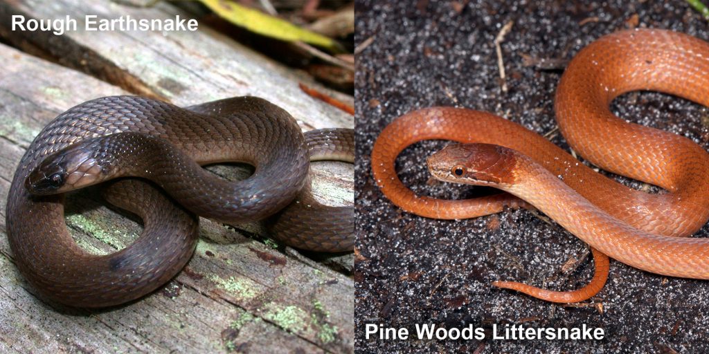 Smooth Earthsnake. Photo courtesy of cassiethegardener/iNaturalist Pine Woods Littersnake. Photo courtesy of Todd Pierson