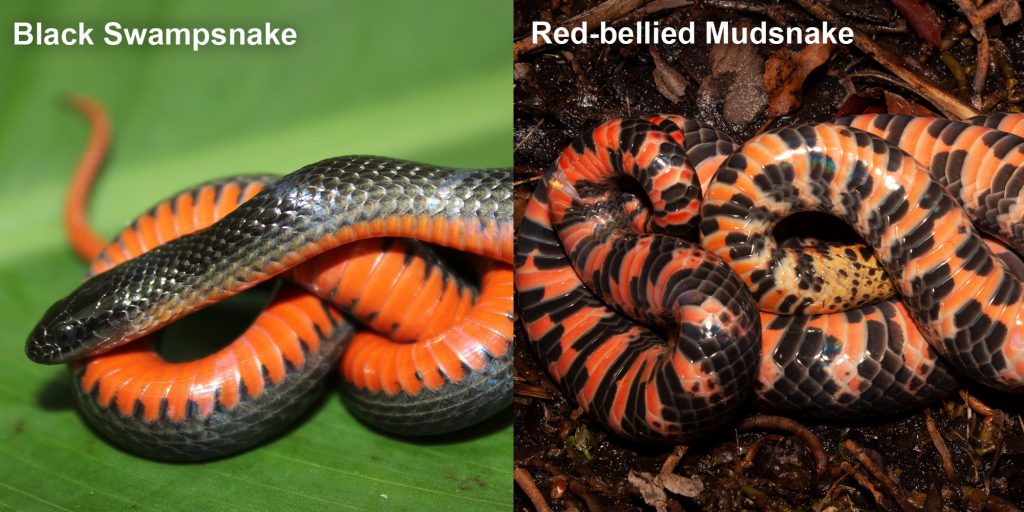 Black Swampsnake with belly color showing. Photo courtesy of Luke Smith. Adult Mudsnake, ventral (belly) coloration. Photo courtesy of Todd Pierson.