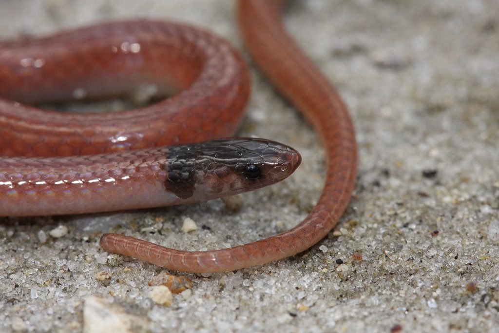 Adult Rim Rock Crowned Snakes are about 7-9 inches (18-23 cm) in total length, with a record length recorded of 11.5 inches (29.2 cm). These small and thin snakes are tan to light brown with a dark brown or black head and neck. Snakes on the Florida Keys often have a complete or broken light-colored band across the back of the head separating the dark head from the dark neck. However, the light-colored band is often missing entirely in snakes on the mainland. The tip of the snout is tan-colored. There is typically a small pale blotch on the side of the head behind each eye. The belly is white or cream-colored and without markings. The scales of the body are smooth and there are 15 scale rows at midbody. The eyes are small, and the pupil is round. Juveniles are similar in coloration to adults.