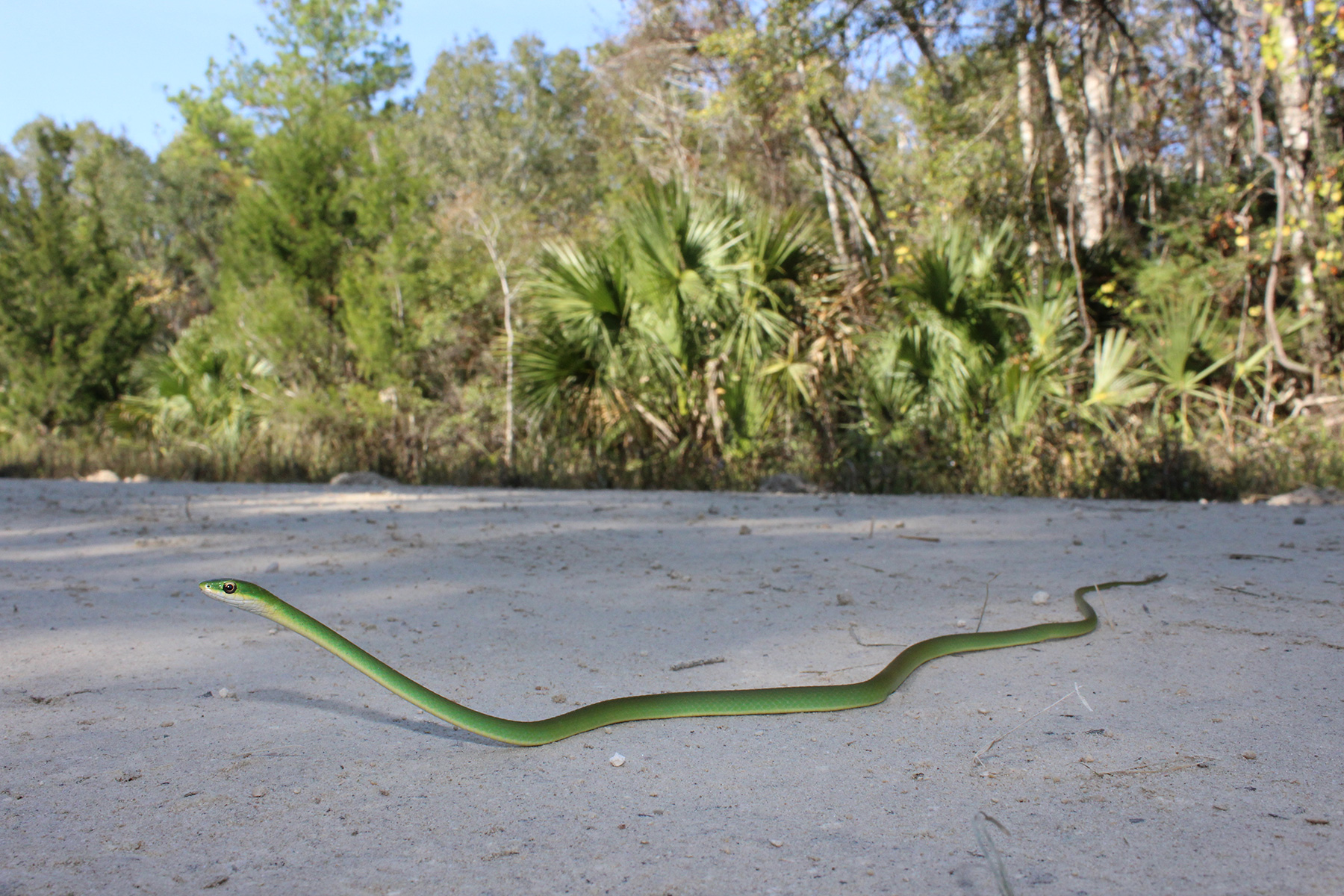Florida Rough Greensnake (Opheodrys aestivus carinatus) Florida Rough Greensnakes occur in the central and southern peninsula and in the Florida Keys. The scales in the second midbody row of dorsal scales are usually keeled, and these snakes are slightly larger than Northern Rough Greensnakes.