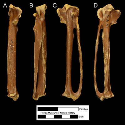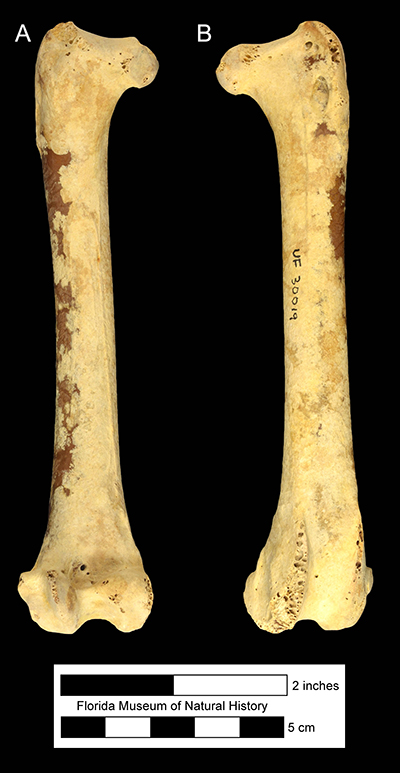 Overall, there are 38 total specimens of Aquila bivia in the Florida Museum of Natural History collection from Inglis 1A. Oddly, it has not been found at other Florida fossil sites of similar age with abundant birds, such as Haile 7C and Macasphalt Shell Pit (Emslie, 1998). It is possible that its presence at Inglis 1A represents a short-lived range extension from western North America (Morgan and Emslie, 2010). Aquila bivia was first informally recognized by Carr (1981), in her Master’s thesis on the fossil birds from Inglis 1A.