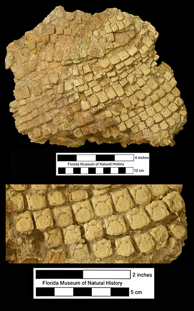 Figure 3. UF 61906, partial articulated carapace of Dasypus bellus from the Shell Materials Pit, Hillsborough County, Florida; early Pleistocene. This is the only known large section of a carapace of this species found articulated in Florida. The top image shows the entire specimen in dorsal view, while below is a close-up view of the pelvic buckler region.