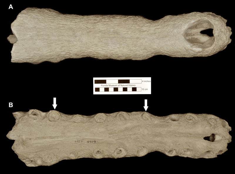 The type specimen of Thecachampsa americana (Fig. 2) was found in a phosphate mine of the Amalgamated Phosphate Company, and presented to the Florida Geological Survey by the general manager of the mine, Anton Schneider. Sellards (1915) originally named the Florida specimen as Tomistoma americana on the basis of fragments of a skull and jaw. This was the first species to be named on the basis of fossils from the Central Florida phosphate mines. Using new and more complete specimens, Mook (1921, 1924) redefined the Florida species and reassigned it to the genus Gavialosuchus. Within the stratigraphic sequence of the deposits from the Central Florida Phosphate Mining District (“Bone Valley”), fossils of Thecachampsa americana have been collected from the middle and late Miocene deposits; none are known to occur in deposits that represent the early Pliocene Palmetto Fauna.