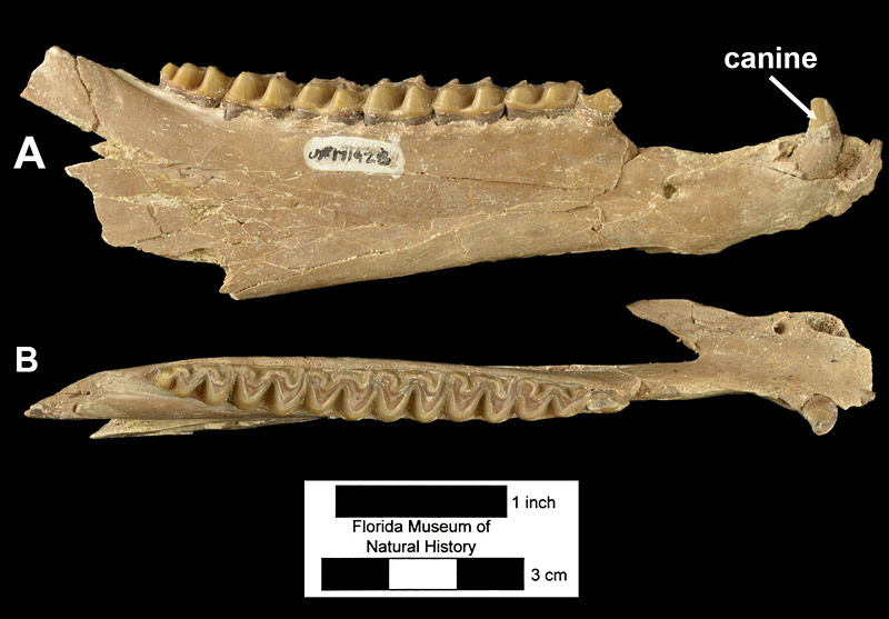 Although not as common as Parahippus, specimens of Archaeohippus blackbergi are often found during fossil digs from Thomas Farm. Skulls of this animal, however, are quite rare. A composite skeleton, made of isolated parts from many individuals, was mounted from bones found during these digs and is displayed in our Florida Fossils exhibit.