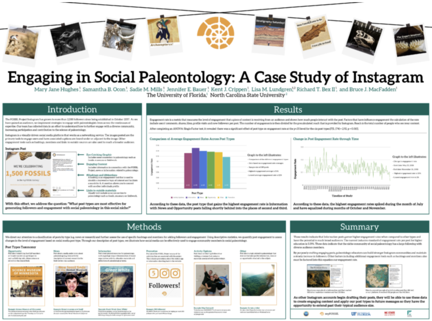 Mary Jane Hughes is a recent UF graduate who majored in Public Relations with a concentration in business and a passion for science communication. Her poster served as a visual representation to help answer the question: “What post types are most effective for generating followers and engagement with social paleontology in this social niche?” The social media team has collected data since the start of the account in an effort to better understand how this unique platform can be used to further engage with a diverse community, increasing participation and contribution to the science of paleontology. From these data, Hughes focused on creating a method of classifying the FOSSIL Project’s posts into six different types. These post types include Opportunity, News, Information, Promotion, Activity Updates, and Other. The results indicate that opportunity and informational posts garner higher engagement rates when compared to other types and have the potential to reach broad, diverse audiences. Read the entire abstract by clicking here.