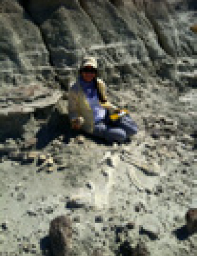 Our second field location in Nebraska was called Sand Creek Flats North and was comprised of fossils from the Chadronian Land Mammal Age. As groups split up and began their hunt, I found myself chatting with Sue Hutchins. She was familiar with the area where we would be looking and wanted to show me where a titanothere skeleton was exposed in the side of the hill. Knowing this could be a great photograph to share with my students I happily followed her to the fossil. While the rest of the group remained admiring the titanothere, I began to wander away from the group taking pictures. The surface of the ground was very bright white and I noticed a dark brown line in the dirt. Upon closer inspection I realized that what I was looking at was a mandible with four teeth, I had found Mesohippus. After applying some glue and doing a little digging I removed the mandible, bagged it, and am anxiously awaiting the photographs from its preparation.