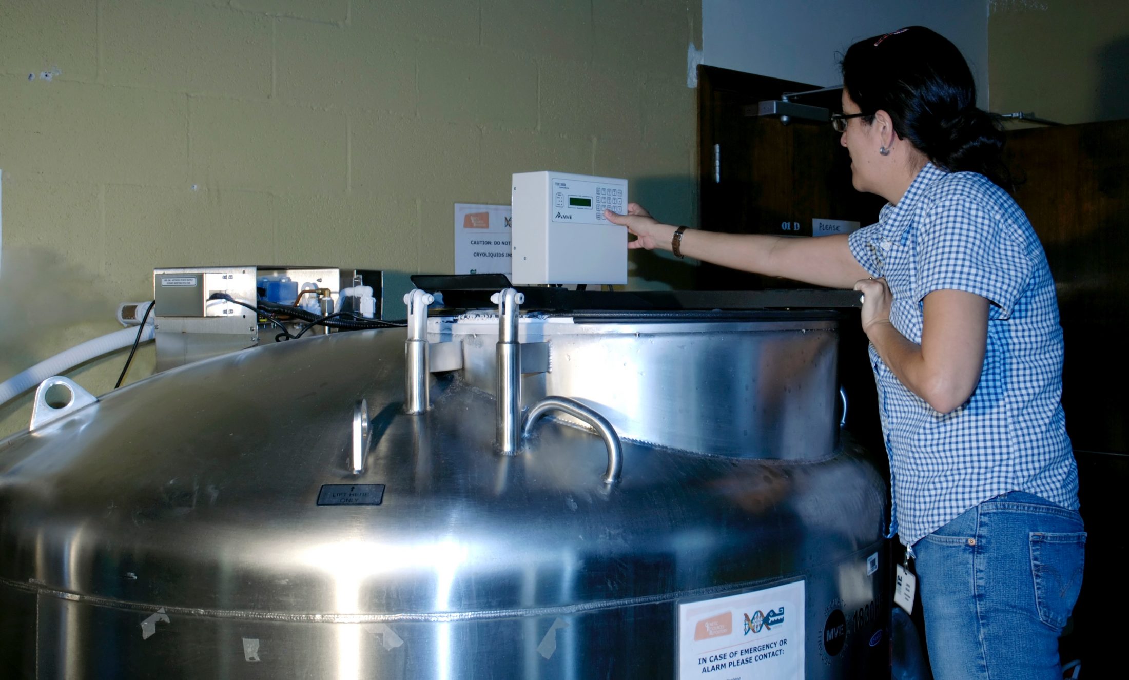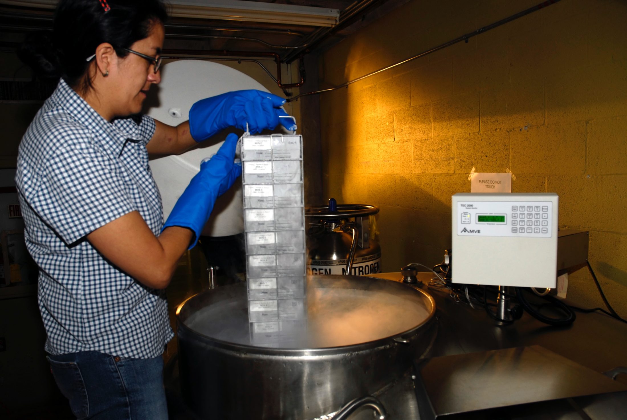 The central component of the Florida Museum of Natural History’s Genetics Resource Repository is a liquid nitrogen freezer (model MVE 1830HE), located in Dickinson Hall on the University of Florida campus. It is designed to maintain temperatures below minus 300 degrees Fahrenheit. The freezer can store nearly 80,000 samples in 2-ml plastic vials.