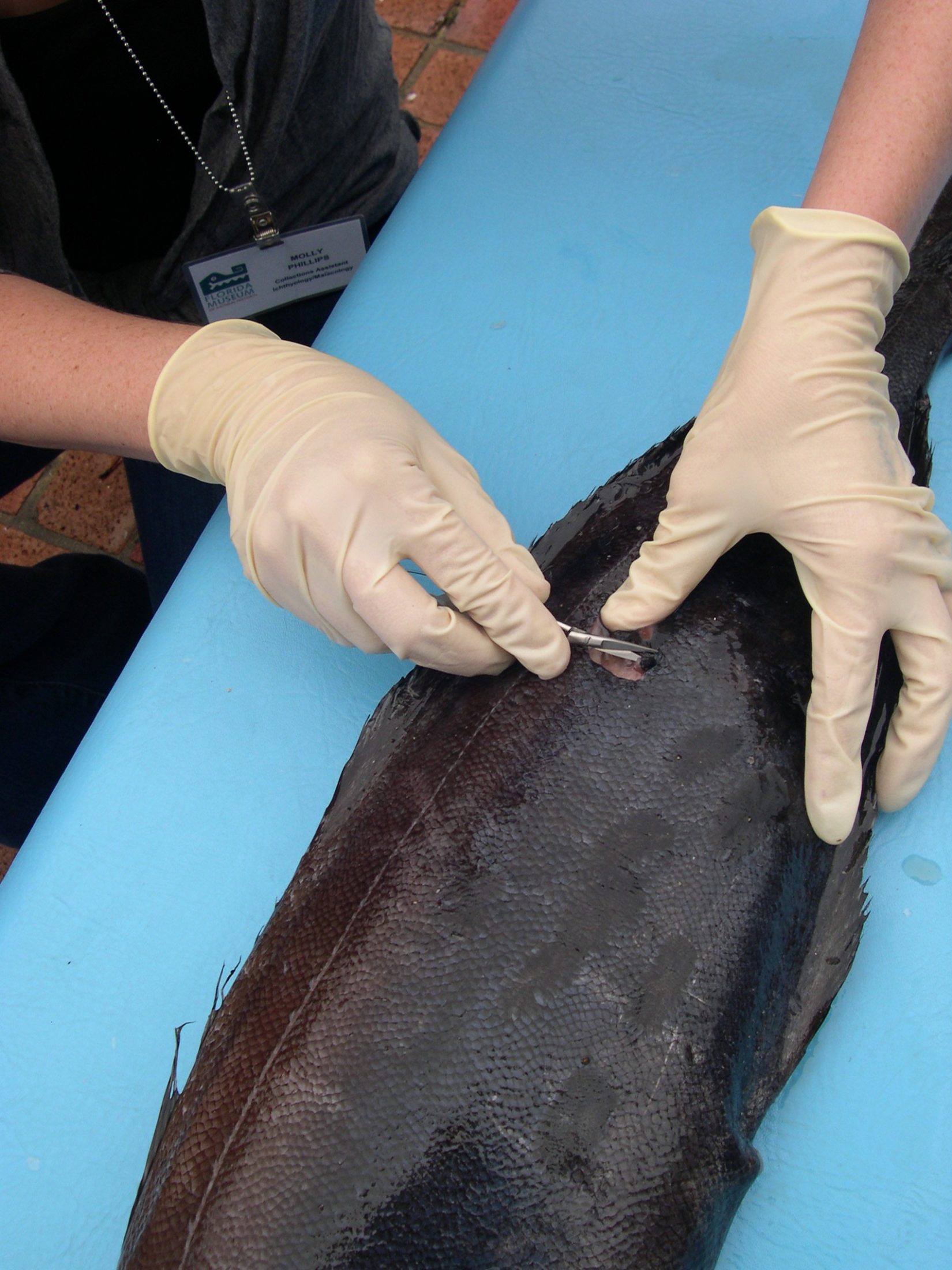 The preparation of specimens consists of obtaining the skin, the skeleton, and the tissues. In this process, additional biological data for the specimen (e.g., approximate age) are obtained and integrated in the database. Normally two sets of tissue samples are prepared from the liver, heart, and muscle; occasionally these samples are preserved in saline solution, but normally no buffer or preservative are used. One tissue sample remains in the GRR at Florida Museum, and the second one is sent to the tissue collection of LSU.