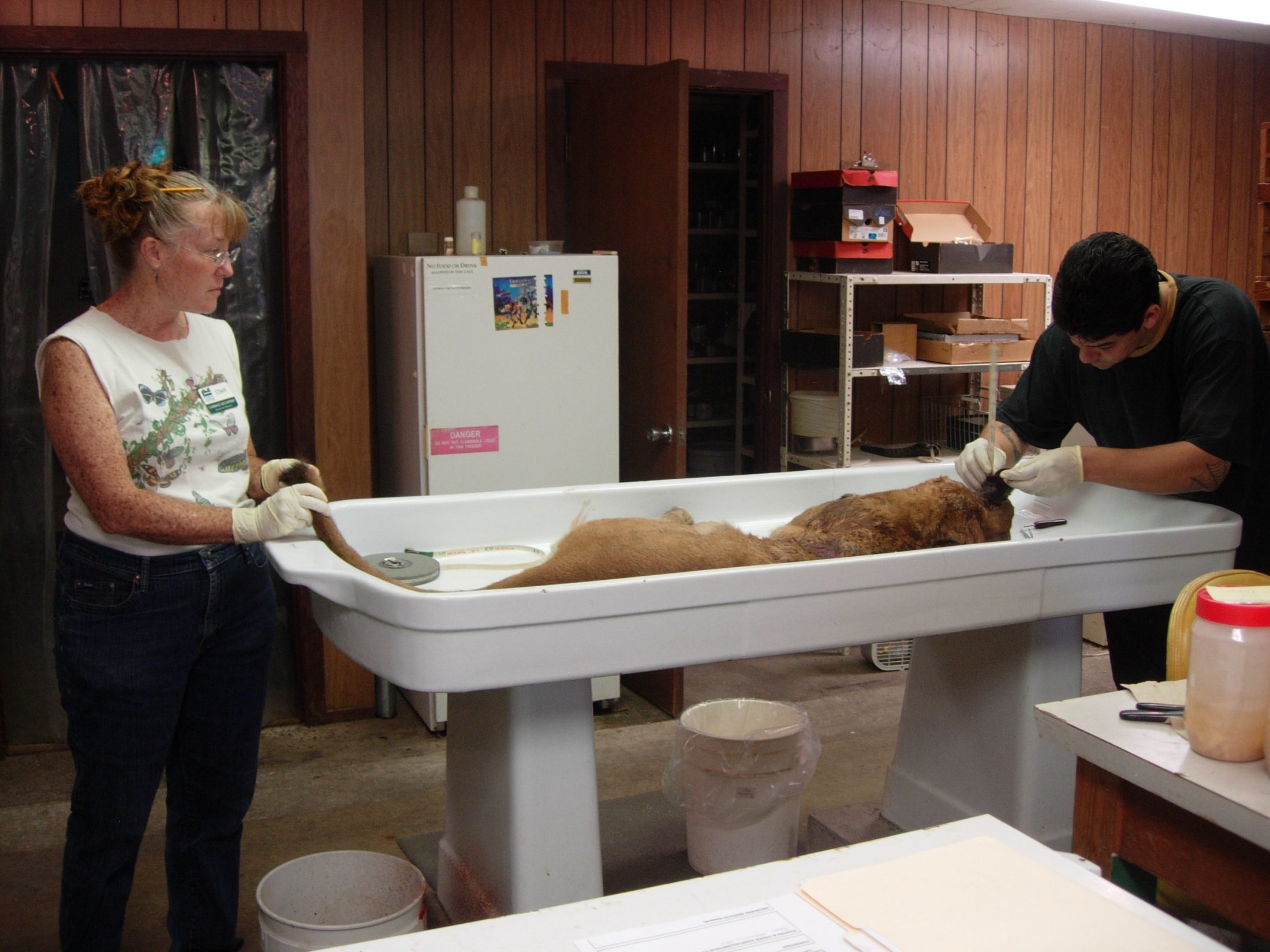 Candace McCaffery, Collections Manager of the Mammal range, and students collect biological data for the specimen and prepare tissue samples of a male Florida Panther approximately one and a half years old that was run over by a car. This specimen was deposited in the Museum by the Florida Game Commission Office.