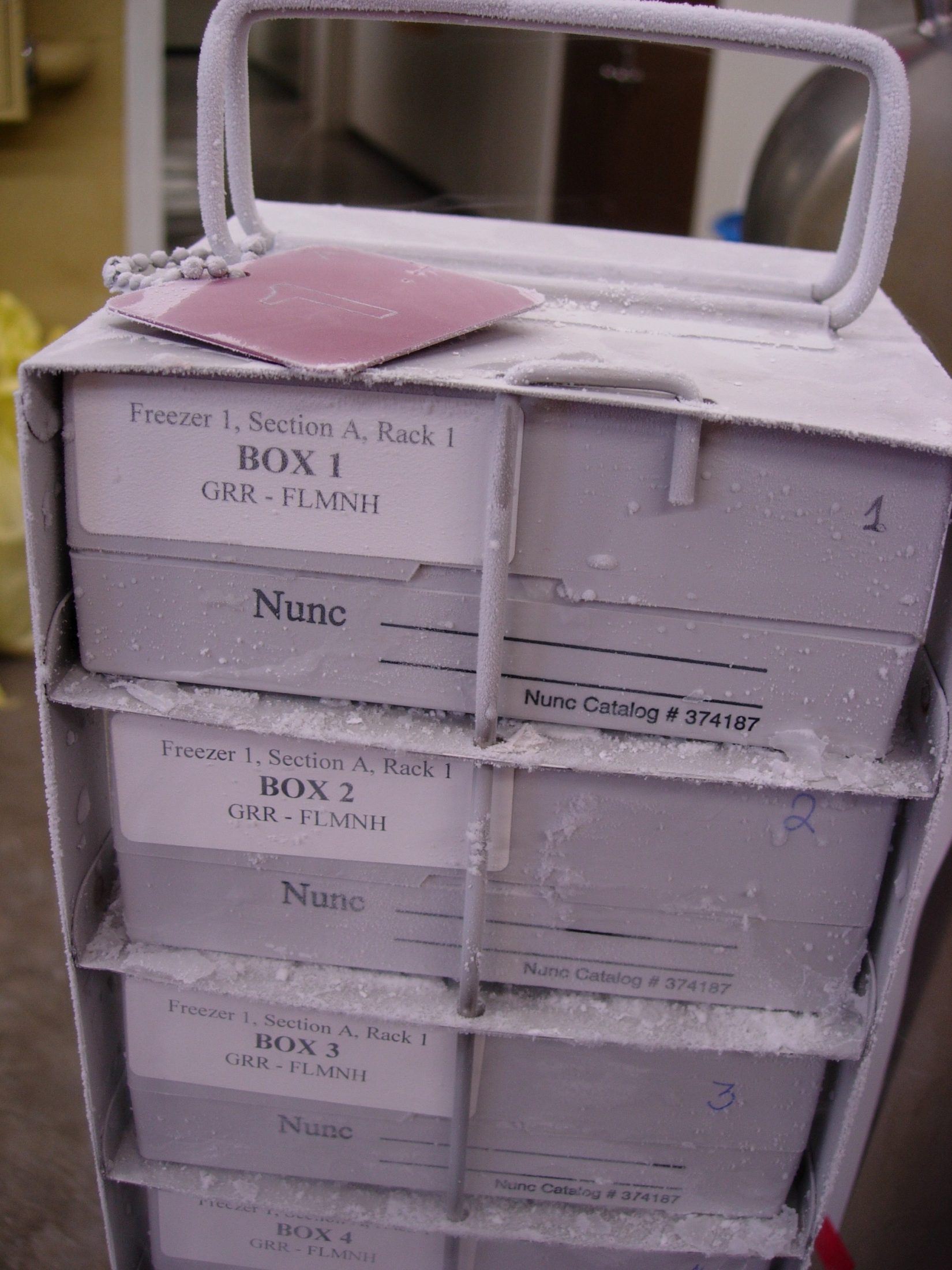 The freezer is equipped with 54 racks arranged in six sections. Each rack holds 13 boxes of 100 vials. When the current configuration reaches capacity, the Museum plans to add 30 racks (designed to hold 25-cell boxes) to reach the freezer’s largest capacity configuration. During regular operation, employees wear leather gloves and a protective face mask to minimize risks associated with handling liquid nitrogen and materials at cryogenic temperatures.