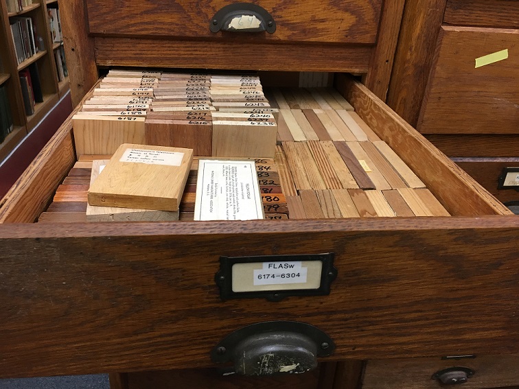 The University of Florida Wood Collection contains approximately 15,700 accessioned wood samples and 1,000+ microscope slides (thin sections, typically transverse radial and tangential views).