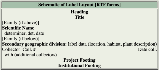 locality, origin, habitat, pltdesc, note, project, permit. All other fields are automatically punctuated, so don’t add any punctuation. - There are options for printing the origin field, if it is used. This is described in the Plabel Quick Guide. By default origin is printed after habitat within the body of the label. If you prefer it to be printed after the collector, please let the Collection Manager know.