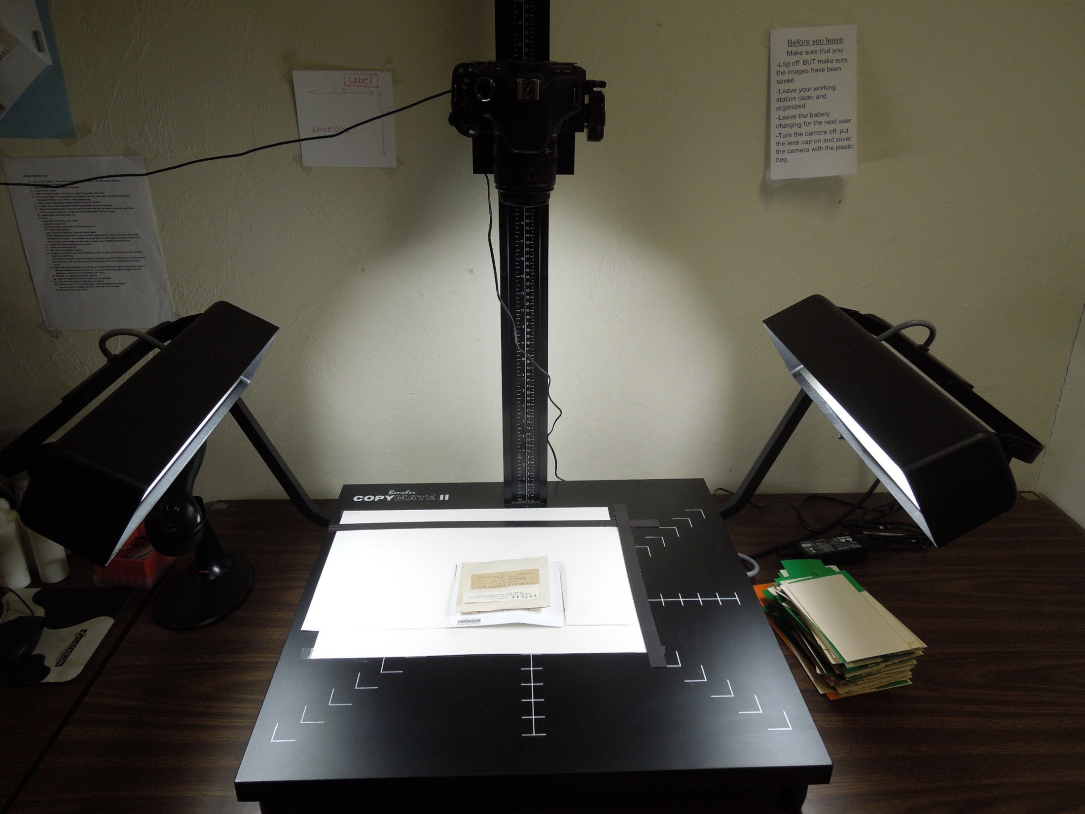 For imaging strictly the packet labels, the old imaging setup was composed of a Bencher Copymate III Fluorescent Tabletop Producer with two cool, full spectrum fluorescent lamps that were daylight balanced at 5200°K for color clarity and operated at 12,000 Hz to eliminate flickering. The fluorescent system maintained a cool temperature, and it offered a full spectrum / daylight balanced light. The copystand included an aluminum column that supported a 35 mm Canon EOS T3i digital camera with a Canon EF 50mm f/2.5 compact macro lens, connected to an AC Canon Adapter kit. The system is connected to the PC computer of the project, and we capture the images using the Canon EOS Utility software coupled with the Imaging Workflow Application provided by on the LBCC – Lichens, Bryophytes and Climate Change Web site. In order to capture the image, small earth magnets (7 mm diameter) were used to fix the specimens to the copystand. The magnets were painted white with an industrial grade paint marker.