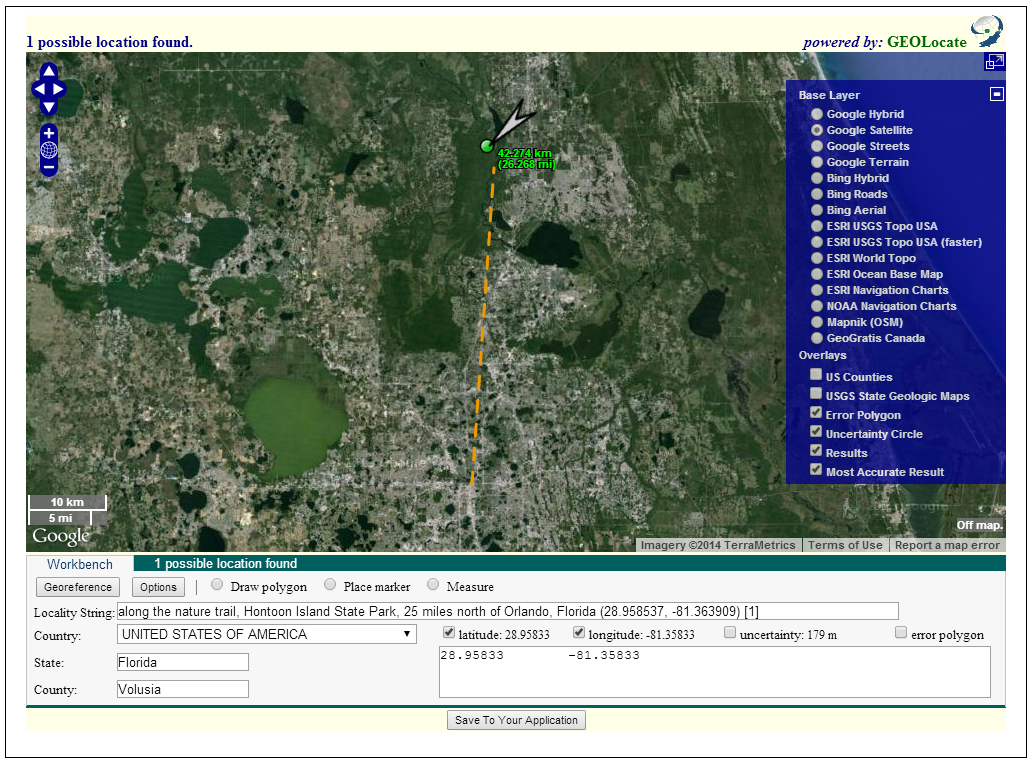 - In the new window of the GeoLocate tool, we will be using the different maps provided to confirm the locality given in the description. We will also be using the tool to place a marker on the approximate spot where the specimen was collected with an uncertainty radius and error polygon, if needed.