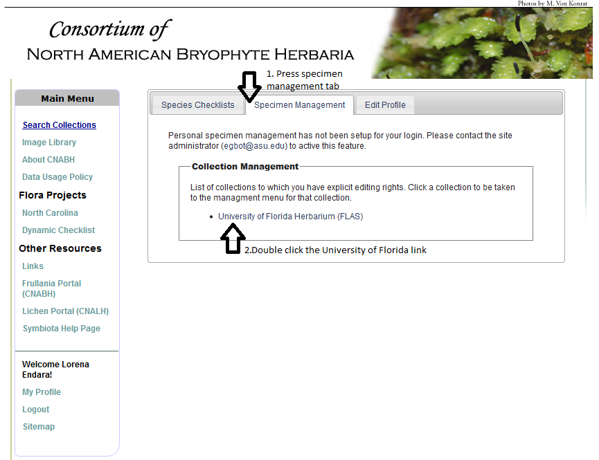 1. When editing Bryophytes (Mosses) and Hepatics (Liverworts), go to http://bryophyteportal.org/portal/. When editing Lichens, go to http://lichenportal.org/portal/. A login is needed and permissions for editing the FLAS specimens are needed. Once that is done, one can proceed.