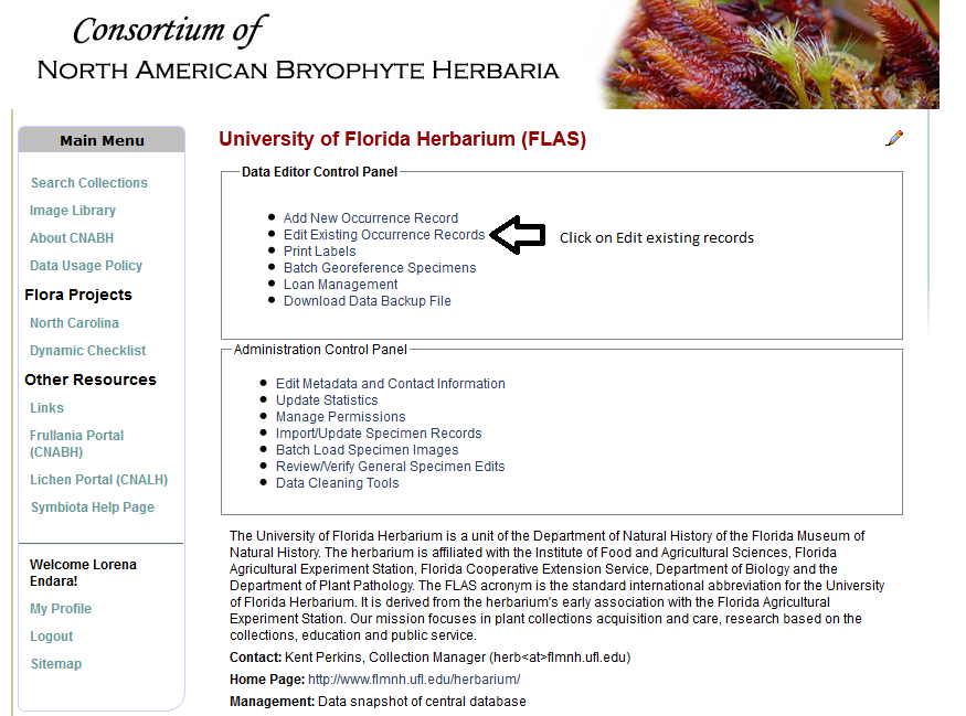 2. Go to the site, login, go to ‘my profile’, ‘occurrence management’, ‘collection management’, click FLAS herbarium. Under Data Editor Control Panel, click ‘edit existing occurrence records’.