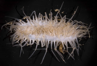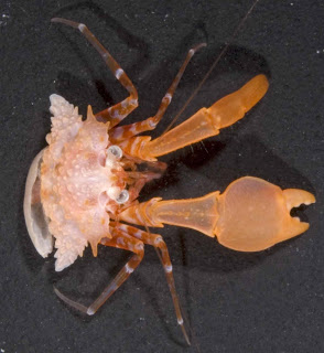 Among the finds were a hermit crab that has just about lost its shell: it wears a miniscule clam to cover its miniaturized abdomen. In its crab-like shape, this new species is unlike any other hermit known. Other hermit crabs collected do not use a shell for covering their abdomen, but instead are covered by zoanthids (a cnidarian related to anemones and corals).