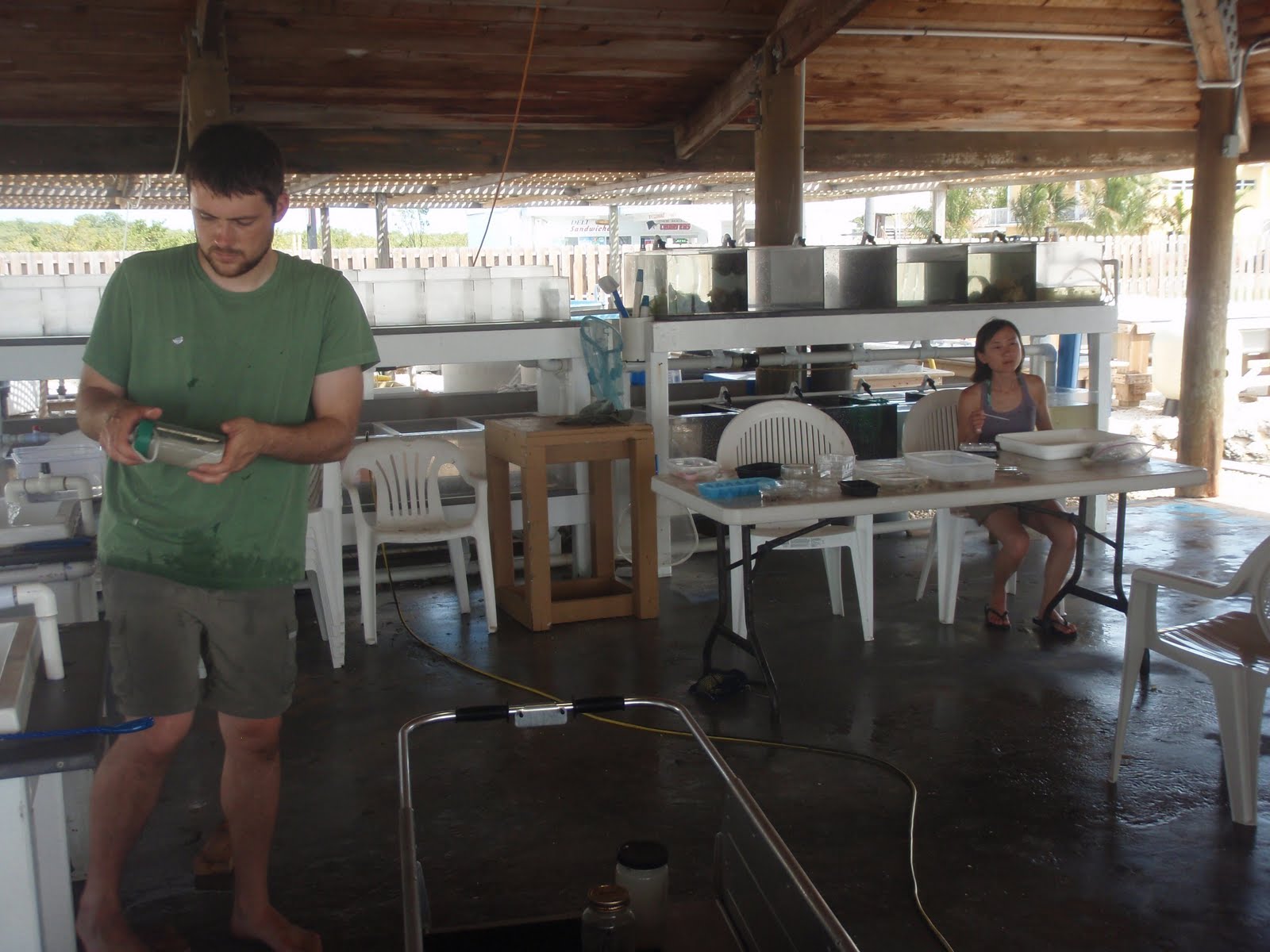 First off, the facility is great, there are dry labs, a wet lab, water tables (for keeping things alive), ample dorm space, and many other sciencey amenities including a boat complete with captain/dive master for diving or snorkeling. In the morning we would usually split into two groups one going out on the boat and the other doing shore-based collecting. Here are Gustav and Nat discussing strategy with the captain.