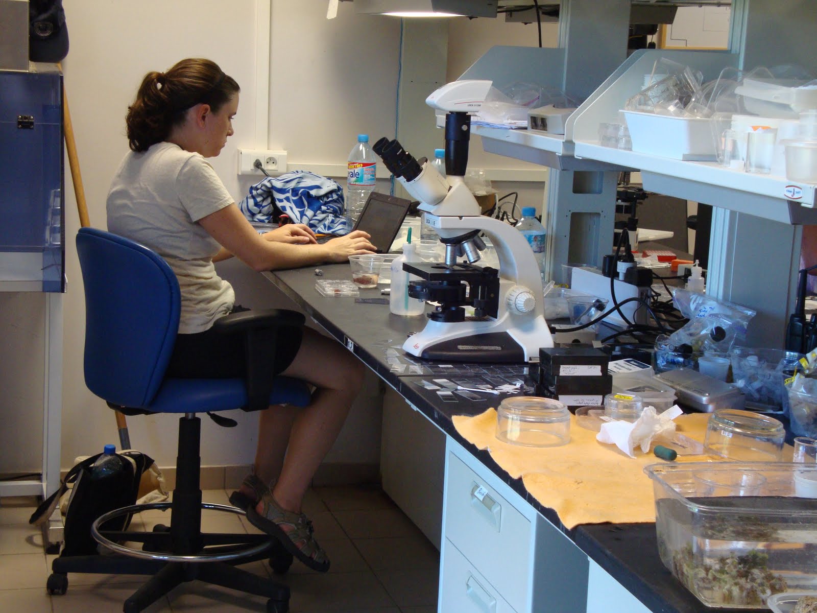 or buckle down to do some lab work. Here she is doing some data entry in Moorea. Although she chose a different chair than I did in the Biocode lab, the focused gaze developed after hours in front of the computer deciphering field notes is one with which I am all too familiar.