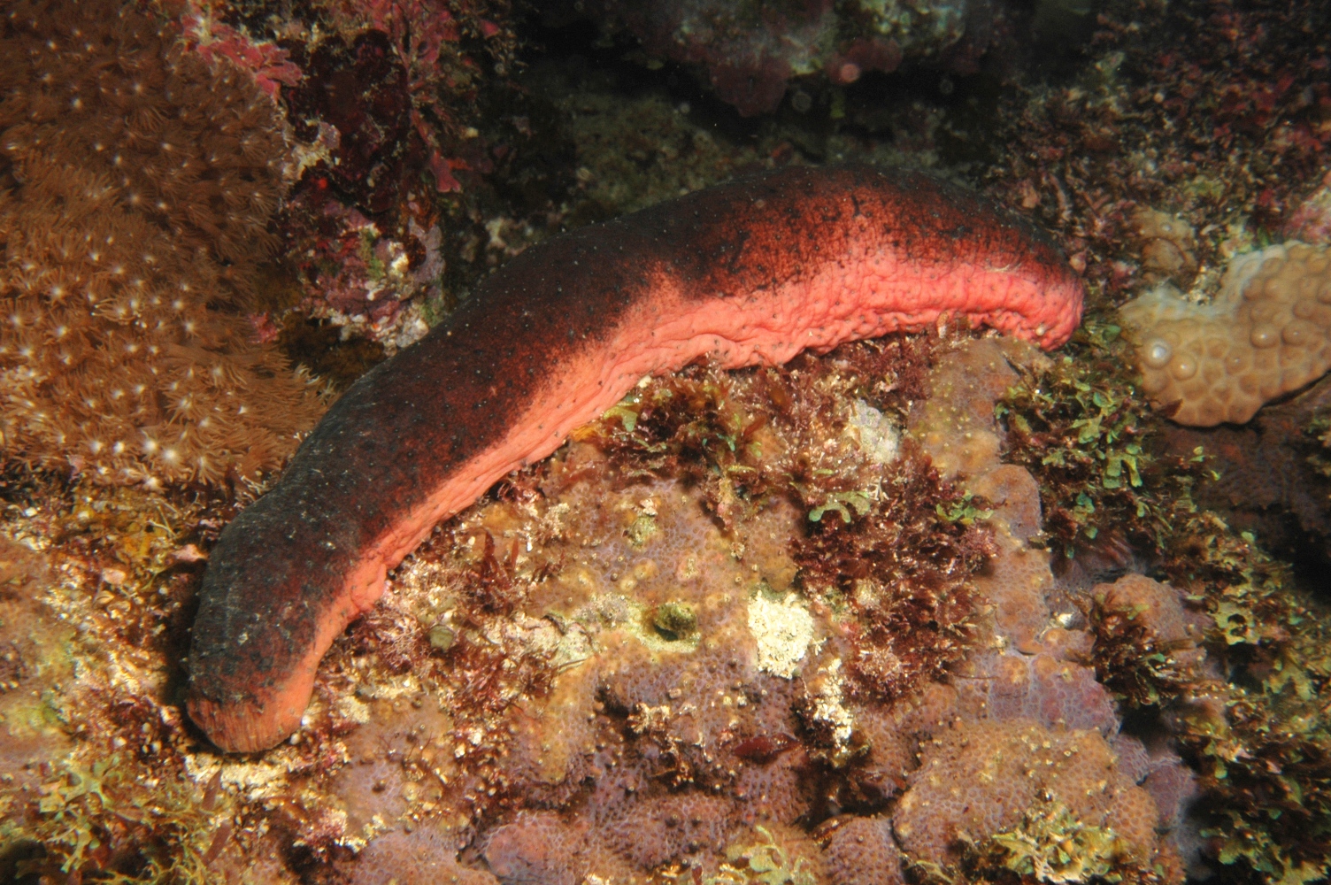 The species complex I’m studying is called Holothuria edulis. In most areas of the Indo-Pacific, Holothuria edulis is easily identifiable. And for good reasons. It looks like a pink sausage that is burnt on one side. It prefers shallow places (less than 10 m / 30 ft) that are a little silty with few waves. That’s why it is usually very common in lagoons and back-reefs. It’s active both during the day and at night.