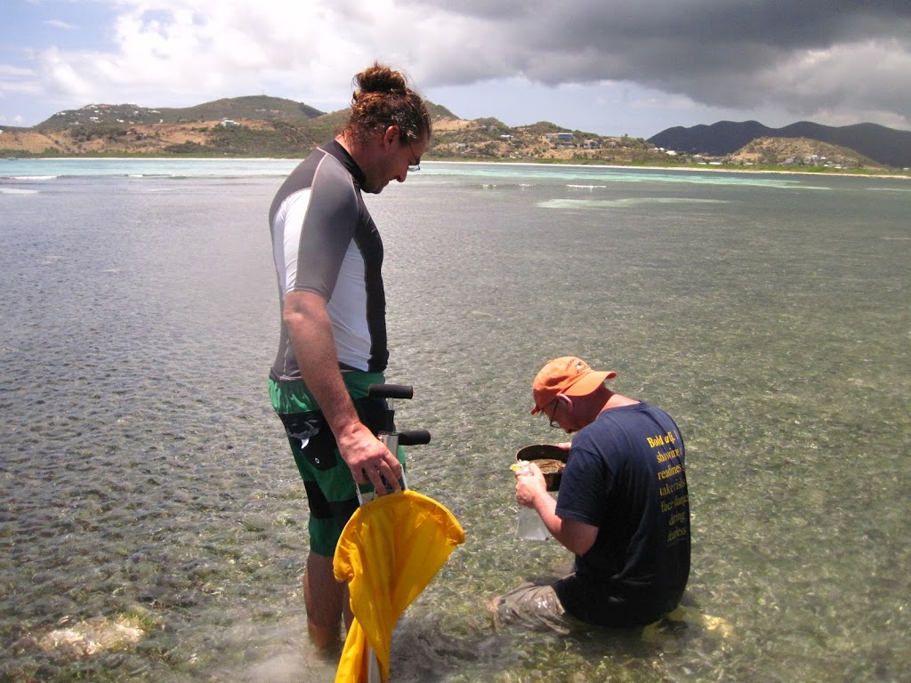 François tried to sneak up on crabs with a metal basket net and hand net. Zach went through the silt and seagrass with a fine mesh net. We all tried to keep our faces out of the green, opaque water.